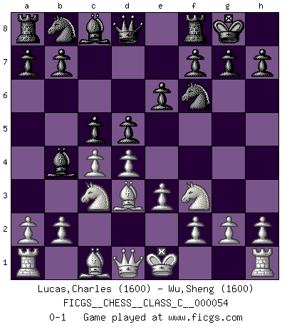 Last move : 0-1 2007 September 13 14:9:33 [Event "FICGS__CHESS__CLASS_C__000054"] [Site "FICGS"] [Date "2007.08.01"] [Round "1"] [White "Lucas,Charles"] [Black "Wu,Sheng"] [Result "0-1"] [WhiteElo "1600"] [BlackElo "1600"] 1.d4 Nf6 2.c4 e6 3.Nc3 Bb4 4.Nf3 c5 5.e3 O-O 6.Bd3 d5 0-1 This chess game has been lost on time (started : 2007.08.01 15:54:42) Nimzo-Indian : Three knights variation Kingside Castling by player Black (move 5) Player Black won this chess game. Follow this game move after move (download)A man without frontiers. He didn't divide the East and the West, he brought them together in their admiration for him. (Ljubomir Ljubojevic, about Bobby Fischer's death) Ja, ich habe einmal eine Blitzpartie gespielt, es war in einem Zug, 1929. --im Interview 1989 (Mikhail Moiseyevich Botvinik) La estratégia requiere pensar, la táctica requiere observación. (Max Euwe) Les échecs, c'est l'art d'analyser. (Mikhail Botvinnik) Cactus - It is depressed cucumber. (Ilmars Cirulis)