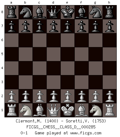 Last move : 0-1 2022 June 1 16:4:55 [Event "FICGS__CHESS__CLASS_D__000285"] [Site "FICGS"] [Date "2022.04.22"] [Round "1"] [White "Clermont,Martin"] [Black "Soretti,Vincenzo"] [Result "0-1"] [WhiteElo "1400"] [BlackElo "1753"] 0-1 This chess game has been lost on time (started : 2022.04.22 9:32:8) Player Black won this chess game. Follow this game move after move (download)There are two classes of men; those who are content to yield to circumstances and who play whist; those who aim to control circumstances, and who play Chess. (Mortimer Collins) Du musst nicht gut spielen, es reicht, wenn du besser spielst als dein Gegner. (Anonymous) Entre mas años cumplo, mas valoro los Peones. (Keres) Soyez une menace à chaque fois que vous vous asseyez pour jouer. (Ken Smith) Your best chance to get a Royal Flush in a casino is in the bathroom. (Anonymous)