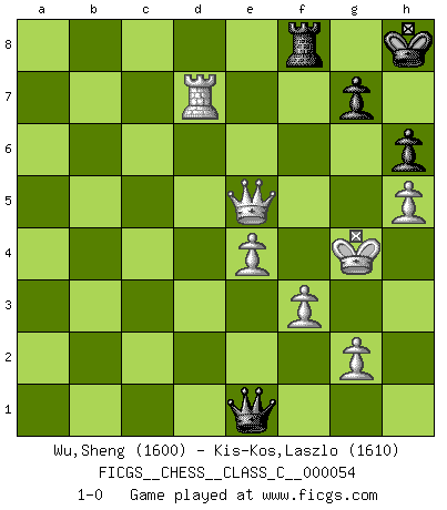 Last move : 1-0 2007 December 3 6:18:59 [Event "FICGS__CHESS__CLASS_C__000054"] [Site "FICGS"] [Date "2007.08.01"] [Round "1"] [White "Wu,Sheng"] [Black "Kis-Kos,Laszlo"] [Result "1-0"] [WhiteElo "1600"] [BlackElo "1610"] 1.e4 c5 2.Nf3 d6 3.d4 cxd4 4.Nxd4 Nf6 5.Nc3 a6 6.Be3 e5 7.Nf3 Be7 8.Bc4 O-O 9.O-O Be6 10.Bxe6 fxe6 11.Na4 Ng4 12.Qd3 b5 13.Nb6 Nxe3 14.Qxe3 Ra7 15.Nd5 Rb7 16.Qd2 Bh4 17.Nxh4 Qxh4 18.Ne3 Rb6 19.f3 Nd7 20.a4 Qg5 21.axb5 axb5 22.Ra7 Nb8 23.Re1 Qd8 24.Rd1 Rf7 25.Ra8 Rc6 26.Qd3 Rb7 27.Rda1 Rc8 28.h4 Qd7 29.h5 h6 30.Rd1 Ra7 31.Rxa7 Qxa7 32.Qb3 Qd7 33.Qb4 Rd8 34.Qa5 Rc8 35.Qb6 Rd8 36.c3 Nc6 37.Qxb5 Qa7 38.Kf2 Rb8 39.Qxc6 Rxb2+ 40.Kg3 Qxe3 41.Qe8+ Kh7 42.Qg6+ Kh8 43.Kh3 Rb8 44.Rxd6 Qxc3 45.Rxe6 Qc8 46.Qf5 Kg8 47.Rxe5 Qb7 48.Rd5 Rf8 49.Qe6+ Kh8 50.Rd7 Qb1 51.Qe5 Qh1+ 52.Kg3 Qe1+ 53.Kg4 1-0 Sicilian : Najdorf, Byrne (English) attack Kingside Castling by player Black (move 8) Kingside Castling by player White (move 9) Player White won this chess game. Follow this game move after move (download)Chess is war over the board. The object is to crush the opponents mind. (Bobby Fischer) Wir können eben der zündenden Macht des Opfers nicht wiederstehen, denn die Begeisterung für das Opfer liegt in der Natur des Menschen. (Rudolf Spielmann) Evita las multitudes. Haz independientemente tu propio razonamiento. Trata de ser el jugador de Ajedrez, no la pieza de Ajedrez. (Ralph Charell) À la honte des hommes, on sait que les lois du jeu sont les seules qui soient partout justes, claires, inviolables et exécutées. Pourquoi l'Indien qui a donné les règles du jeu d'échecs est-il obéi de bon gré dans toute la terre, et que les décrétales des papes, par exemple, sont aujourd'hui un objet d'horreur et de mépris ? C'est que l'inventeur des échecs combina tout avec justesse pour la satisfaction des joueurs, et que les papes, dans leurs décrétales, n'eurent en vue que leur seul avantage. L'Indien voulut exercer également l'esprit des hommes et leur donner du plaisir; les papes ont voulu abrutir l'esprit des hommes. Voltaire (Dictionnaire philosophique / Garnier 1967) Tree pose grows confidence. It roots me to this world. (Terri Guillemets)