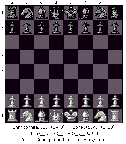Last move : 0-1 2022 June 1 16:4:55 [Event "FICGS__CHESS__CLASS_D__000285"] [Site "FICGS"] [Date "2022.04.22"] [Round "1"] [White "Charbonneau,Benoit"] [Black "Soretti,Vincenzo"] [Result "0-1"] [WhiteElo "1400"] [BlackElo "1753"] 0-1 This chess game has been lost on time (started : 2022.04.22 9:32:8) Player Black won this chess game. Follow this game move after move (download)When you are lonely, when you feel yourself an alien in the world, play Chess. This will raise your spirits and be your counselor in war. (Aristotle) Wie bekannt hörte Morphy 1859 auf, Schach zu spielen. Seine Enttäuschung galt nicht so sehr dem Schach, wie den Schachspielern. (Robert James Fischer) ¿Porque tengo que perder ante este idiota?. (Aron Nimzovich) La conception d'un plan est le processus par lequel un joueur exploite les avantages de sa position tout en s'efforçant d'en réduire au minimum les inconvénients. Afin de garantir le succès, un plan doit toujours se fonder sur un diagnostic objectif des particularités d'une position. La conception d'un plan est d'autant plus difficile que la position est équilibrée, et grandement facilitée lorsqu'il n'existe qu'un seul plan susceptible de répondre aux exigences de la position. (Harry Golombek) The question of whether computers can think is just like question of whether submarines can swim. (Edsger W. Dijkstra)