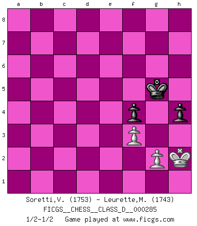 Last move : 1/2-1/2 2022 May 24 8:55:8 [Event "FICGS__CHESS__CLASS_D__000285"] [Site "FICGS"] [Date "2022.04.22"] [Round "1"] [White "Soretti,Vincenzo"] [Black "Leurette,Marc-Antoine"] [Result "1/2-1/2"] [WhiteElo "1753"] [BlackElo "1743"] 1.e4 e5 2.Nf3 Nc6 3.Bb5 Nf6 4.d3 d6 5.c3 Bd7 6.O-O Be7 7.Re1 a6 8.Ba4 b5 9.Bc2 O-O 10.Nbd2 a5 11.Nf1 h6 12.h3 a4 13.a3 Be6 14.Ne3 Na5 15.Nd2 c5 16.b3 axb3 17.Nxb3 Nxb3 18.Bxb3 c4 19.dxc4 Nxe4 20.Qd3 Nc5 21.Qb1 Nxb3 22.Qxb3 Rb8 23.Nd5 bxc4 24.Nxe7+ Qxe7 25.Qc2 f6 26.a4 d5 27.Ba3 Qf7 28.Bxf8 Qxf8 29.a5 Ra8 30.Reb1 Qc5 31.Qa4 d4 32.Rb5 Qc8 33.cxd4 Bd7 34.Rc5 Bxa4 35.Rxc8+ Rxc8 36.Rxa4 c3 37.Ra1 c2 38.Rc1 exd4 39.Kf1 d3 40.Ke1 Kf7 41.Kd2 Rd8 42.a6 Ke6 43.a7 Ra8 44.Ra1 Kd5 45.Kxd3 Rxa7 46.Rc1 Rc7 47.Rxc2 Rxc2 48.Kxc2 Ke4 49.Kd2 f5 50.Ke2 f4 51.f3+ Kf5 52.Kf2 h5 53.h4 g5 54.hxg5 Kxg5 55.Kg1 Kf5 56.Kh2 h4 57.Kh3 Kg5 58.Kh2 1/2-1/2 Ruy Lopez : Berlin defense Kingside Castling by player White (move 6) Kingside Castling by player Black (move 9) 10 pieces endgame at move 47 : White KRPPP , Black KRPPP WHITE : King + 1 Rook 3 Pawns BLACK : King + 1 Rook 3 Pawns 9 pieces endgame at move 47 : White KPPP , Black KRPPP WHITE : King + 3 Pawns BLACK : King + 1 Rook 3 Pawns 8 pieces endgame at move 48 : White KPPP , Black KPPP WHITE : King + 3 Pawns BLACK : King + 3 Pawns 7 pieces endgame at move 54 : White KPPP , Black KPP WHITE : King + 3 Pawns BLACK : King + 2 Pawns 6 pieces endgame at move 54 : White KPP , Black KPP WHITE : King + 2 Pawns BLACK : King + 2 Pawns This chess game ended in a draw. Follow this game move after move (download)I like to say that Bobby Fischer was the greatest player ever. But what made Fischer a genius was his ability to blend an American freshness and pragmatism with Russian ideas about strategy. (Bruce Pandolfini) Das typische an einem Großmeister ist, daß er eine gewonnene Position schnell und schmerzlos gewinnt. (Irving Chernev) Antes de los Finales, los dioses han colocado el Juego Medio. (Siegbert Tarrasch) Il s'avisa de me proposer d'apprendre les échecs qu'il jouait un peu... me voilà forcené des échecs. J'achète un échiquier, je m'enferme dans ma chambre, j'y passe des jours et des nuits à vouloir apprendre par cur toutes les parties. (Jean-Jacques Rousseau, Confessions) Follow your passion, and success will follow you. (Arthur Buddhold)