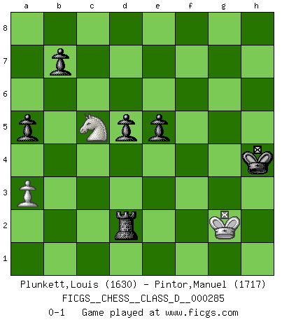 Last move : 0-1 2022 November 12 12:25:55 [Event "FICGS__CHESS__CLASS_D__000285"] [Site "FICGS"] [Date "2022.04.22"] [Round "1"] [White "Plunkett,Louis"] [Black "Pintor,Manuel"] [Result "0-1"] [WhiteElo "1630"] [BlackElo "1717"] 1.c4 e5 2.g3 Bc5 3.Nc3 Nc6 4.Bg2 d6 5.Nf3 Bf5 6.d3 Nf6 7.O-O O-O 8.a3 a5 9.Nh4 Bg4 10.Nf3 h5 11.Bg5 Ne7 12.e3 c6 13.h3 Bxf3 14.Bxf3 Qd7 15.Kh2 Qf5 16.Bxf6 Qxf6 17.Bxh5 Qh6 18.Bf3 Nf5 19.Ne4 Bxe3 20.fxe3 Nxe3 21.Qe2 Nxf1+ 22.Rxf1 f5 23.Nc3 Rf6 24.Qf2 Kf7 25.Qe2 g5 26.g4 Rh8 27.Qg2 Qh4 28.gxf5 Qf4+ 29.Kg1 Qe3+ 30.Kh2 Rxf5 31.Ne4 Ke7 32.Ng3 Rf7 33.Ne4 Rg8 34.Ng3 Rgf8 35.Ne4 Rxf3 36.Rxf3 Rxf3 37.Qxg5+ Qxg5 38.Nxg5 Rxd3 39.h4 Kf6 40.Ne4+ Kg6 41.Kg2 Kh5 42.Nf2 Rb3 43.Ne4 Rxb2+ 44.Kg3 Rb3+ 45.Kg2 Rd3 46.Ng3+ Kxh4 47.Ne4 d5 48.cxd5 cxd5 49.Nc5 Rd2+ 0-1 English Opening Kingside Castling by player White (move 7) Kingside Castling by player Black (move 7) 10 pieces endgame at move 48 : White KNPP , Black KRPPPP WHITE : King + 1 Knight 2 Pawns BLACK : King + 1 Rook 4 Pawns 9 pieces endgame at move 48 : White KNP , Black KRPPPP WHITE : King + 1 Knight 1 Pawn BLACK : King + 1 Rook 4 Pawns Player Black won this chess game. Follow this game move after move (download)Don't even mention losing to me. I can't stand to think of it. (Bobby Fischer) Ich verachte Kasparow. (Viktor Kortschnoi) El juego de Fischer siempre fue nítido, racional y brillante. Uno de los mejores por siempre. (Dave Regis) Les Echecs représentent une sphère d'idées créatrices basée sur la volonté des deux protagonistes. (Smyslov) Luck is the residue of design. (John Milton)
