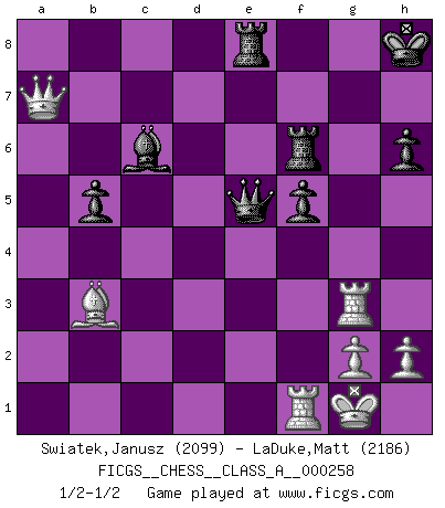 Last move : 1/2-1/2 2022 July 11 6:42:45 [Event "FICGS__CHESS__CLASS_A__000258"] [Site "FICGS"] [Date "2022.04.30"] [Round "1"] [White "Swiatek,Janusz"] [Black "LaDuke,Matt"] [Result "1/2-1/2"] [WhiteElo "2099"] [BlackElo "2186"] 1.d4 Nf6 2.c4 c6 3.Nc3 d5 4.Nf3 e6 5.e3 Nbd7 6.Qc2 Bd6 7.Bd3 dxc4 8.Bxc4 O-O 9.O-O b5 10.Bd3 Bb7 11.e4 e5 12.Bg5 exd4 13.e5 Nxe5 14.Nxe5 Bxe5 15.f4 dxc3 16.fxe5 Qd4+ 17.Kh1 Rad8 18.Bf5 cxb2 19.Rae1 h6 20.Bxf6 gxf6 21.e6 fxe6 22.Bxe6+ Kg7 23.Bb3 Qd6 24.Qxb2 Rfe8 25.Rd1 Qe7 26.Rc1 Rd6 27.Rc3 Bc8 28.a4 Bd7 29.Rg3+ Kh8 30.axb5 cxb5 31.Qf2 f5 32.Qxa7 Bc6 33.Qf2 Qe5 34.Kg1 Rf6 35.Qa7 Re7 36.Qb6 Re8 37.Qa7 Re7 38.Qb6 Re8 39.Qa7 1/2-1/2 Queen's pawn game Kingside Castling by player Black (move 8) Kingside Castling by player White (move 9) This chess game ended in a draw. Follow this game move after move (download)Life is like a game of Chess, changing with each move. (Chinese proverb) Schach ist eine Sache der genauen Beurteilung, wann man zuschlagen und wann man sich ducken muss. (Robert James Fischer) Robert Fischer es la ley hacia si mismo. (Larry Evans) Aux échecs, l'amour-propre est satisfait quand on remporte la victoire, mais il n'y a pas de honte à être battu. (Benjamin Franklin) Tomorrow's what you make of it. (Horatio Caine, C.S.I. Miami)