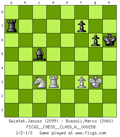 Last move : 1/2-1/2 2022 August 13 21:45:41 [Event "FICGS__CHESS__CLASS_A__000258"] [Site "FICGS"] [Date "2022.04.30"] [Round "1"] [White "Swiatek,Janusz"] [Black "Bussoli,Marco"] [Result "1/2-1/2"] [WhiteElo "2099"] [BlackElo "2060"] 1.d4 Nf6 2.c4 e6 3.Nf3 Be7 4.Nc3 d5 5.Bf4 O-O 6.e3 c5 7.dxc5 Nc6 8.cxd5 Nxd5 9.Nxd5 exd5 10.Rc1 Qa5+ 11.Qd2 Qxa2 12.Be2 Bf6 13.Nd4 Re8 14.Nb5 Qxb2 15.Nc7 Bf5 16.g4 Be4 17.Nxe8 Bxh1 18.Nc7 Rc8 19.Nb5 Be4 20.f3 Bg6 21.Qxb2 Bxb2 22.Rd1 Nb4 23.Nxa7 Ra8 24.Nb5 Bc2 25.Rd2 Ra2 26.Kf2 h6 27.Bf1 Bc1 28.Re2 Ra1 29.Re1 Bd3 30.h4 Ra2+ 31.Kg3 Bd2 32.Rd1 Bxf1 33.Rxf1 Nd3 34.Nd4 Be1+ 35.Kh3 Bb4 36.c6 Nxf4+ 37.exf4 Bd6 38.cxb7 Bxf4 39.Rh1 Rb2 40.Nf5 Kh7 41.g5 Rxb7 42.Rd1 hxg5 43.hxg5 g6 44.Ng3 Bxg5 45.Rxd5 Kh6 46.Ne4 Bc1 47.Nd6 Ra7 48.Kg3 Kh7 49.Rd1 Bh6 50.Nb5 Re7 51.Nc3 Ra7 52.Ne2 Be3 53.Nc3 Kh6 54.Rd3 Bc5 1/2-1/2 Queen's pawn game Kingside Castling by player Black (move 5) 10 pieces endgame at move 44 : White KRNP , Black KRBPPP WHITE : King + 1 Rook 1 Knight 1 Pawn BLACK : King + 1 Rook 1 Bishop 3 Pawns 9 pieces endgame at move 45 : White KRNP , Black KRBPP WHITE : King + 1 Rook 1 Knight 1 Pawn BLACK : King + 1 Rook 1 Bishop 2 Pawns This chess game ended in a draw. Follow this game move after move (download)If Chess is a science, it's a most inexact one. If Chess is an art, it is too exacting to be seen as one. If Chess is a sport, it's too esoteric. If Chess is a game, it's too demanding to be just a game. If Chess is a mistress, she's a demanding one. If Chess is a passion, it's a rewarding one. If Chess is life, it's a sad one. (Unknown) Wenn Capablanka heute auf der Schachbühne erscheinen würde, hätte er ein halbes Jahr gebraucht um sich die Schachtheorie anzueignen. Und dann hätte er alles und jeden besiegt. (Mikhail Moiseyevich Botvinik) La vida es como un juego de Ajedrez, cambiando con cada movimiento. (Proverbio Chino) Aidez vos pièces, elles vous aideront. (Paul Morphy) Have no fear of perfection - you'll never reach it. (Salvador Dali)