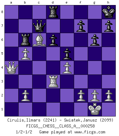 Last move : 1/2-1/2 2022 June 9 20:43:33 [Event "FICGS__CHESS__CLASS_A__000258"] [Site "FICGS"] [Date "2022.04.30"] [Round "1"] [White "Cirulis,Ilmars"] [Black "Swiatek,Janusz"] [Result "1/2-1/2"] [WhiteElo "2241"] [BlackElo "2099"] 1.e4 c5 2.Nc3 Nc6 3.Nge2 Nf6 4.d4 cxd4 5.Nxd4 e5 6.Ndb5 d6 7.Bg5 a6 8.Na3 b5 9.Nd5 Be7 10.Bxf6 Bxf6 11.c3 Bg5 12.Nc2 Rb8 13.a4 bxa4 14.Ncb4 Nxb4 15.cxb4 Bd7 16.Bxa6 O-O 17.O-O Bc6 18.Rxa4 Bxa4 19.Qxa4 Kh8 20.Bb5 Qc8 21.Bc6 Bd8 22.b5 Bb6 23.Nxb6 Rxb6 24.Rd1 Qc7 25.Qa3 Rd8 26.Qa4 g6 27.Rd3 1/2-1/2 Sicilian : chameleon variation Kingside Castling by player Black (move 16) Kingside Castling by player White (move 17) This chess game ended in a draw. Follow this game move after move (download)Many Chess players were surprised when after the game, Fischer quietly explained: 'I had already analyzed this possibility' in a position which I thought was not possible to foresee from the opening. (Mikhail Tal) Intelligenz läßt sich nicht am Weg, sondern nur am Ergebnis feststellen. (Garry Kasparov) Cada Peón es potencialmente una Reina. (James Mason) Tout change constamment, y compris dans le monde des Echecs. (Botvinnik) When you stop learning you start dying. (Scott Adams)