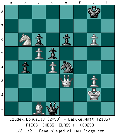Last move : 1/2-1/2 2022 August 19 22:23:52 [Event "FICGS__CHESS__CLASS_A__000258"] [Site "FICGS"] [Date "2022.04.30"] [Round "1"] [White "Czudek,Bohuslav"] [Black "LaDuke,Matt"] [Result "1/2-1/2"] [WhiteElo "2033"] [BlackElo "2186"] 1.d4 Nf6 2.c4 c6 3.Nf3 d5 4.e3 Bf5 5.Nc3 e6 6.Nh4 Bg6 7.Be2 Nbd7 8.O-O Be7 9.g3 a6 10.Qb3 b5 11.c5 a5 12.Nxg6 hxg6 13.f4 Ng8 14.Kg2 f5 15.h4 Ndf6 16.Rh1 b4 17.Na4 g5 18.Nb6 Ra7 19.hxg5 Rxh1 20.Kxh1 Ne4 21.Bf3 Bxg5 22.Kg2 Ngf6 23.Qa4 Qc7 24.a3 bxa3 25.Rxa3 Kf8 26.b4 g6 27.Qd1 axb4 28.Rxa7 Qxa7 29.fxg5 Nxg5 30.e4 Nxf3 31.exf5 Qa2+ 32.Kxf3 Ne4 33.Qe2 Qb3+ 34.Qe3 Qd1+ 35.Kg2 Kg8 36.fxg6 Qc2+ 37.Kf3 Qd1+ 38.Kg2 1/2-1/2 Queen's pawn game Kingside Castling by player White (move 8) This chess game ended in a draw. Follow this game move after move (download)Whoever sees no other aim in the game than that of giving checkmate to one's opponent will never become a good Chess player. (Euwe) Darum geht es im Schach. Einen Tag gibst du deinem Gegner eine Lektion, am nächsten Tag gibt er dir eine. (Robert James Fischer) Un Peón pasado es un criminal, quién debe ser mantenido bajo candado y llave. Leves medidas, tales como vigilancia policiaca, no son suficientes. (Aaron Nimzovich) Il s'avisa de me proposer d'apprendre les échecs qu'il jouait un peu... me voilà forcené des échecs. J'achète un échiquier, je m'enferme dans ma chambre, j'y passe des jours et des nuits à vouloir apprendre par cur toutes les parties. (Jean-Jacques Rousseau, Confessions) I fear not the man who has practiced 10,000 kicks once, but I fear the man who has practiced one kick 10,000 times. (Bruce Lee)