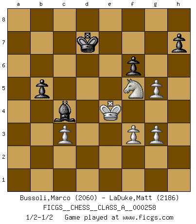 Last move : 1/2-1/2 2022 August 21 20:21:41 [Event "FICGS__CHESS__CLASS_A__000258"] [Site "FICGS"] [Date "2022.04.30"] [Round "1"] [White "Bussoli,Marco"] [Black "LaDuke,Matt"] [Result "1/2-1/2"] [WhiteElo "2060"] [BlackElo "2186"] 1.d4 Nf6 2.c4 e6 3.Nf3 d5 4.g3 Bb4+ 5.Bd2 Be7 6.Bg2 c6 7.Bc3 dxc4 8.a4 a5 9.Na3 b5 10.axb5 Bxa3 11.Rxa3 cxb5 12.Qd2 Bb7 13.Bxa5 Qe7 14.Bb4 Ne4 15.Rxa8 Bxa8 16.Bxe7 Nxd2 17.Kxd2 Kxe7 18.Ra1 Nd7 19.Ra5 Bc6 20.Ne1 Kd6 21.Kc3 Rb8 22.Kb4 Nb6 23.e4 Kc7 24.Ra7+ Rb7 25.Ra6 Rb8 26.Nc2 Na4 27.d5 exd5 28.exd5 Bd7 29.d6+ Kd8 30.Ka3 Nc5 31.Ra7 Rb6 32.Ra8+ Bc8 33.Kb4 Nd7 34.Ka5 Rxd6 35.Nb4 Nb6 36.Ra7 c3 37.bxc3 Bd7 38.Bc6 Bxc6 39.Kxb6 Bd7 40.Kc5 Rh6 41.Ra8+ Kc7 42.Ra7+ Kd8 43.h4 Rh5+ 44.Kd6 Rh6+ 45.Kc5 Rh5+ 46.Kd4 Be6 47.Nc6+ Kc8 48.Ne7+ Kd8 49.Nc6+ Kc8 50.Ne5 Rf5 51.f3 f6 52.Nc6 Rd5+ 53.Ke4 Rd7 54.Rxd7 Kxd7 55.Nd4 Bc4 56.Nf5 g5 57.hxg5 1/2-1/2 Queen's pawn game This chess game ended in a draw. Follow this game move after move (download)Fischer is an American Chess tragedy on par with Morphy and Pillsbury. (Mig Greengard) Oft bringt ein stiller Zug das Erdbeben. (Richard Reti) La belleza de un movimiento no se refleja solo en su apariencia, sino en el pensamiento detrás de él. (Siegbert Tarrasch) Les Echecs sont affaire de jugement sensible. Savoir quand frapper et quand esquiver. (Fischer) If only people were all showed a certain minimum level of niceness; if only people didn't retract verbal draw offers (without draw box ticked) on ficgs; if only people didn't kill; if only people didn't run concentration / extermination camps, if only people didn't drop nuclear bombs on Hiroshima and Nagasaki, and so on - it would be a much more beautiful world. But sadly, things are not so... (Normajean Yates)