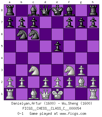 Last move : 0-1 2007 September 12 1:59:44 [Event "FICGS__CHESS__CLASS_C__000054"] [Site "FICGS"] [Date "2007.08.01"] [Round "1"] [White "Danielyan,Artur"] [Black "Wu,Sheng"] [Result "0-1"] [WhiteElo "1600"] [BlackElo "1600"] 1.c4 e5 2.Nc3 Nf6 3.g3 d5 4.cxd5 Nxd5 5.Bg2 Nb6 6.Nf3 Nc6 0-1 This chess game has been lost on time (started : 2007.08.01 15:54:42) English : Bremen, reverse Dragon Player Black won this chess game. Follow this game move after move (download)I had a toothache during the first game. In the second game I had a headache. In the third game it was an attack of rheumatism. In the fourth game, I wasn't feeling well. And in the fifth game? Well, must one have to win every game ? (Siegbert Tarrasch) Ich könnte leicht behaupten: Ja,ja, Leonid Breschnew wollte nicht, daß ich Weltmeister werde. In der Tat war die Sache komplizierter. (Viktor Kortschnoi) La única cosa que los jugadores de Ajedrez tienen en común, es el Ajedrez. (Lodewijk Prins) Il n'y a plus de joueurs du niveau de Jacob Murray dont la seule quête est le beau jeu, le plaisir de voir les pièces construire quelque chose. Sur 10 idées à la minute, 9 seront sans intérêt, la dernière s'avèrera géniale. (Christian Bauer) Luck is the residue of design. (John Milton)