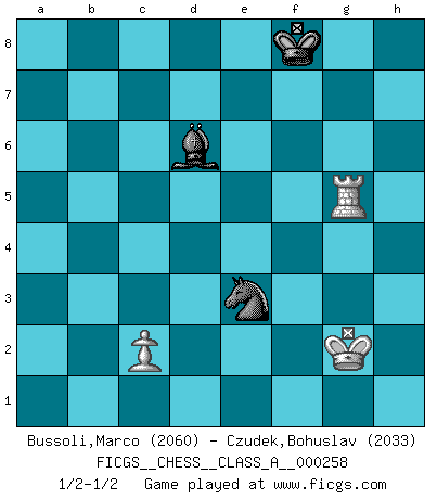 Last move : 1/2-1/2 2022 August 29 21:53:8 [Event "FICGS__CHESS__CLASS_A__000258"] [Site "FICGS"] [Date "2022.04.30"] [Round "1"] [White "Bussoli,Marco"] [Black "Czudek,Bohuslav"] [Result "1/2-1/2"] [WhiteElo "2060"] [BlackElo "2033"] 1.e4 c5 2.Nf3 d6 3.d4 cxd4 4.Nxd4 Nf6 5.Nc3 a6 6.f3 e5 7.Nb3 Be6 8.Be3 h5 9.Be2 Nbd7 10.f4 Qc7 11.h3 Be7 12.O-O b5 13.a3 O-O 14.Kh1 Bc4 15.fxe5 dxe5 16.Bg5 Bxe2 17.Qxe2 Qc4 18.Qf3 a5 19.Nd2 Qc5 20.g4 hxg4 21.hxg4 b4 22.axb4 axb4 23.Rxa8 Rxa8 24.Be3 Qc8 25.Nd5 Nxd5 26.Qxf7+ Kh8 27.exd5 Nf6 28.Rf5 Ra1+ 29.Kg2 Bc5 30.Nf1 Rxf1 31.Rg5 Qg8 32.Qxg8+ Kxg8 33.Kxf1 Bxe3 34.Rxe5 Bd4 35.Re2 Bxb2 36.d6 Bc1 37.Re7 Kf8 38.Rb7 g5 39.Kg2 Bf4 40.Rxb4 Bxd6 41.Rb5 Nxg4 42.Rxg5 Ne3+ 1/2-1/2 Sicilian : Najdorf Kingside Castling by player White (move 12) Kingside Castling by player Black (move 13) 10 pieces endgame at move 35 : White KRPPP , Black KBNPP WHITE : King + 1 Rook 3 Pawns BLACK : King + 1 Bishop 1 Knight 2 Pawns 9 pieces endgame at move 40 : White KRPPP , Black KBNP WHITE : King + 1 Rook 3 Pawns BLACK : King + 1 Bishop 1 Knight 1 Pawn 8 pieces endgame at move 40 : White KRPP , Black KBNP WHITE : King + 1 Rook 2 Pawns BLACK : King + 1 Bishop 1 Knight 1 Pawn 7 pieces endgame at move 41 : White KRP , Black KBNP WHITE : King + 1 Rook 1 Pawn BLACK : King + 1 Bishop 1 Knight 1 Pawn 6 pieces endgame at move 42 : White KRP , Black KBN WHITE : King + 1 Rook 1 Pawn BLACK : King + 1 Bishop 1 Knight This chess game ended in a draw. Follow this game move after move (download)Morphy was probably the greatest genius of them all. (Bobby Fischer) Im Reiche der Wirklichkeit ist man nie so glücklich wie im Reiche der Gedanken. (Arthur Schopenhauer) ¿Se han dado cuenta de que Fischer casi nunca ha tenido piezas malas? El las intercambia y las piezas malas se quedan con sus oponenets. (Yuri Balashov) Je fais ceci parce que dans cinquante coups j'obtiendrai cela; je m'appelle Mikhail Moisevitch Botvinnik. (Botvinnik) For to win one hundred victories in one hundred battles is not the acme of skill. To subdue the enemy without fighting is the acme of skill. (Sun Tzu)