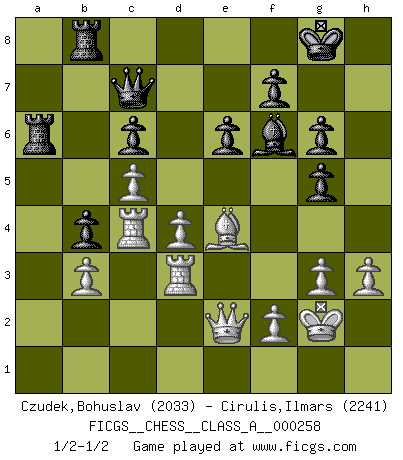 Last move : 1/2-1/2 2022 August 10 17:17:36 [Event "FICGS__CHESS__CLASS_A__000258"] [Site "FICGS"] [Date "2022.04.30"] [Round "1"] [White "Czudek,Bohuslav"] [Black "Cirulis,Ilmars"] [Result "1/2-1/2"] [WhiteElo "2033"] [BlackElo "2241"] 1.d4 d5 2.c4 c6 3.Nf3 Nf6 4.e3 Bf5 5.Nc3 e6 6.Nh4 Bg6 7.Be2 Nbd7 8.O-O Bd6 9.g3 O-O 10.Nxg6 hxg6 11.b3 a6 12.Bb2 Re8 13.Bf3 g5 14.a3 b5 15.Rc1 Qe7 16.c5 Bc7 17.e4 dxe4 18.Nxe4 Nd5 19.Nc3 N7f6 20.Re1 Qd7 21.h3 Nxc3 22.Bxc3 Nd5 23.Bd2 Bd8 24.Rc2 a5 25.Qc1 b4 26.axb4 Nxb4 27.Bxb4 axb4 28.Qe3 Bf6 29.Rc4 Reb8 30.Rd1 Qc7 31.Be4 Ra6 32.Qf3 Bd8 33.Kg2 g6 34.Qe2 Bf6 35.Rd3 1/2-1/2 QGD Slav : 4.e3 Bf5 Kingside Castling by player White (move 8) Kingside Castling by player Black (move 9) This chess game ended in a draw. Follow this game move after move (download)Pawns are born free, yet they are everywhere in chains. (Rick Kennedy) Vom Schach wurde gesagt das Leben sei dafür nicht lange genug. Aber das ist der Fehler des Lebens, nicht des Schach'. (Irving Chernev) El Ajedrez era la lengua materna de Capablanca. (Reti) Nous sommes les pions de la mystérieuse partie d'Echecs jouée par Dieu. Il nous déplace, nous arrête, nous pousse encore, puis nous lance un à un dans la boîte du Néant. Epitaphe sur la tombe de David Janowsky (1868-1927). I don't diet. I just don't eat as much as I'd like to. (Linda Evangelista, supermodel)
