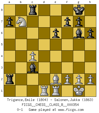 Last move : 0-1 2022 June 22 18:31:12 [Event "FICGS__CHESS__CLASS_B__000354"] [Site "FICGS"] [Date "2022.05.01"] [Round "1"] [White "Trigance,Emile"] [Black "Salonen,Jukka"] [Result "0-1"] [WhiteElo "1804"] [BlackElo "1863"] 1.c4 Nf6 2.d4 e6 3.Nc3 d5 4.Bg5 Be7 5.e3 O-O 6.Nf3 Nbd7 7.Rc1 c6 8.Bd3 dxc4 9.Bxc4 h6 10.Bh4 b5 11.Bd3 Bb7 12.e4 b4 13.e5 bxc3 14.exf6 Nxf6 15.bxc3 c5 16.O-O Rc8 17.Be2 Qa5 18.dxc5 Qxc5 19.Bxf6 Bxf6 20.c4 Be4 21.Nd2 Bg6 22.Nb3 Qa3 23.Qd2 Rfd8 24.Qa5 Qxa5 25.Nxa5 Rd2 26.Rfe1 Rxa2 27.Nb7 Bb2 28.Rcd1 Bc3 0-1 English, 1...Nf6 (Anglo-Indian defense) Kingside Castling by player Black (move 5) Kingside Castling by player White (move 16) Player Black won this chess game. Follow this game move after move (download)Chess is like war on a board. (Bobby Fischer) Der Verteidiger gebe der Gewalt nach, aber nur der Gewalt. Er schaffe sich nicht freiwillig, etwa aus Blindheit oder aus Schrecken, irgendwelche Schwächen. Er lasse sich nicht bluffen. (Emanuel Lasker) El juego del Ajedrez no es solamente una diversión quieta; algunas cualidades muy valuables de la mente se pueden adquirir y cultivar con el, como convertirlos en habitos disponibles para toda ocasión; ya que la vida es algo así como el Ajedrez. (Benjamin Franklin) C'est une question de caractère, Beaucoup de gens perdent leur motivation très vite. D'autres, ils sont rares, peuvent la conserver très longtemps. J'aime les échecs, encore aujourd'hui je suis heureux d'analyser des parties. J'aime toujours gagner, je déteste encore perdre. Bien jouer est important pour mon intégrité intellectuelle et morale. Et puis les échecs vivent en ce moment une période historique grâce à Internet. Ils se développent dans les systèmes éducatifs à travers le monde. Ils sortent de leur ghetto, et c'est mon rôle de mener à bien cette révolution. (Gary Kasparov) They say poker is a zero-sum game. It must be, because every time I play my sum ends up zero. (Max Shapiro)
