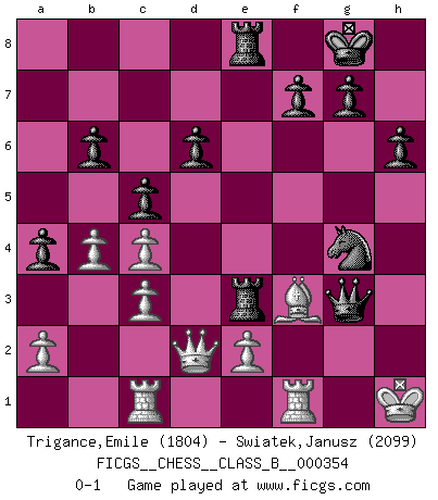 Last move : 0-1 2022 August 10 15:27:13 [Event "FICGS__CHESS__CLASS_B__000354"] [Site "FICGS"] [Date "2022.05.01"] [Round "1"] [White "Trigance,Emile"] [Black "Swiatek,Janusz"] [Result "0-1"] [WhiteElo "1804"] [BlackElo "2099"] 1.c4 e5 2.Nc3 Nf6 3.Nf3 Nc6 4.g3 Bb4 5.Bg2 O-O 6.O-O e4 7.Ne1 Bxc3 8.dxc3 h6 9.Nc2 d6 10.Ne3 Re8 11.Qc2 a5 12.Nd5 Bf5 13.Ne3 Qc8 14.Nxf5 Qxf5 15.h3 Qe6 16.b3 Ne7 17.Be3 Nf5 18.Qd2 Nxe3 19.Qxe3 b6 20.Rad1 a4 21.Ra1 Ra5 22.b4 Rh5 23.g4 Re5 24.Qd4 c5 25.Qd2 e3 26.fxe3 Rxe3 27.Bf3 Qe5 28.Rac1 Qg3+ 29.Kh1 Qxh3+ 30.Kg1 Qg3+ 31.Kh1 Nxg4 0-1 English Opening Kingside Castling by player Black (move 5) Kingside Castling by player White (move 6) Player Black won this chess game. Follow this game move after move (download)My opponents make good moves too. Sometimes I don't take these things into consideration. (Bobby Fischer) In der Schule lernt man nichts. Es ist nur Zeitverschwendung. (Robert James Fischer) Algunos sacrificios son sólidos, los demás son míos. (Mikhail Tal) J'apprécie les joueurs d'est-indienne, c'est grâce à eux que je nourris ma famille depuis tant d'années. (Petrosian) Before all elsed, be armed. (Niccolo Machiavelli)