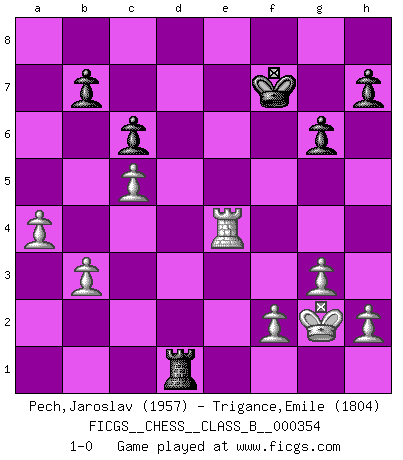 Last move : 1-0 2022 November 1 8:24:17 [Event "FICGS__CHESS__CLASS_B__000354"] [Site "FICGS"] [Date "2022.05.01"] [Round "1"] [White "Pech,Jaroslav"] [Black "Trigance,Emile"] [Result "1-0"] [WhiteElo "1957"] [BlackElo "1804"] 1.e4 e5 2.Nf3 Nc6 3.Bb5 f5 4.Nc3 fxe4 5.Nxe4 d5 6.Nxe5 dxe4 7.Nxc6 Qd5 8.c4 Qd6 9.Nxa7 Bd7 10.Bxd7+ Qxd7 11.Qh5+ g6 12.Qe5+ Kf7 13.Nb5 c6 14.Qd4 Rd8 15.Qxd7+ Rxd7 16.Nc3 Nf6 17.b3 Bc5 18.O-O Rhd8 19.Rb1 Bb4 20.Re1 Rd3 21.Nxe4 Nxe4 22.Rxe4 Bxd2 23.g3 Bxc1 24.Rxc1 Rd2 25.Rce1 R8d7 26.R1e2 Rd1+ 27.Kg2 Ra1 28.Rf4+ Kg7 29.c5 Rad1 30.a4 Rf7 31.Rxf7+ Kxf7 32.Re4 1-0 Ruy Lopez : Schliemann defense, Berger variation Kingside Castling by player White (move 18) Player White won this chess game. Follow this game move after move (download)Those who say they understand Chess, understand nothing. (Robert Hubner) Herr Iljumschinow ist ein etwas merkwürdiger Geschäftsmann: Er arbeitet zusammen mit Leuten wie Muammar al-Gaddafi; früher ist das Saddam Hussein gewesen. (Joel Lautier) Botvinnik trató de alejar el misterio referente al Ajedrez, siempre relacionandolo a situaciones de la vida diaria. Solía llamar al Ajedrez un problema inexacto típico, similar a aquellos en que la gente tiene siempre que resolver a cada día. (Garry Kasparov) On est toujours la mazette de quelqu'un d'autre. (Anonyme) Everything in life is luck. (Donald Trump)