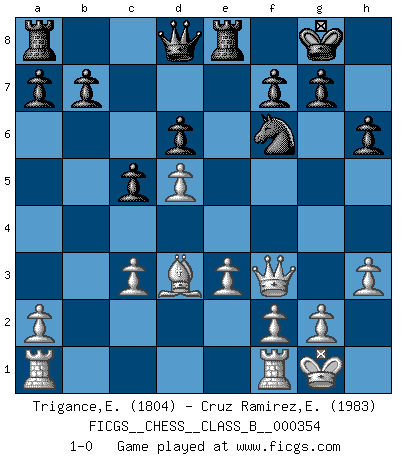 Last move : 1-0 2022 August 7 6:2:11 [Event "FICGS__CHESS__CLASS_B__000354"] [Site "FICGS"] [Date "2022.05.01"] [Round "1"] [White "Trigance,Emile"] [Black "Cruz Ramirez,Eliecer"] [Result "1-0"] [WhiteElo "1804"] [BlackElo "1983"] 1.c4 Nf6 2.d4 e6 3.Nc3 Bb4 4.Bg5 c5 5.d5 Bxc3+ 6.bxc3 d6 7.e3 O-O 8.Nf3 h6 9.Bh4 Re8 10.Bd3 exd5 11.cxd5 Bg4 12.h3 Bxf3 13.Qxf3 Nbd7 14.Bxf6 Nxf6 15.O-O 1-0 English, 1...Nf6 (Anglo-Indian defense) Kingside Castling by player Black (move 7) Kingside Castling by player White (move 15) Player White won this chess game. Follow this game move after move (download)What is the object of playing a gambit opening?... To acquire a reputation of being a dashing player at the cost of losing a game. (Siegbert Tarrasch) Über die Verhaftung Bobby Fischers: Warum es die Bush-Administration für nötig befindet einen 61 Jahre alten Mann zu hetzten, der für niemanden ausser sich selbste eine Gefahr darstellt ist ein Rätsel. (Nigel Short) Los Peones son nacidos libres, y aún así, se encuentran por doquier encadenados. (Rick Kennedy) Dieu déplace le joueur, et celui-ci la pièce. Quel Dieu derrière Dieu commence donc la trame ? Arturo Perez-Reverte (prix de littérature policière 1993). Perhaps chess is the wrong game for the times (The Chess Master and the Computer, by Garry Kasparov - 2010)