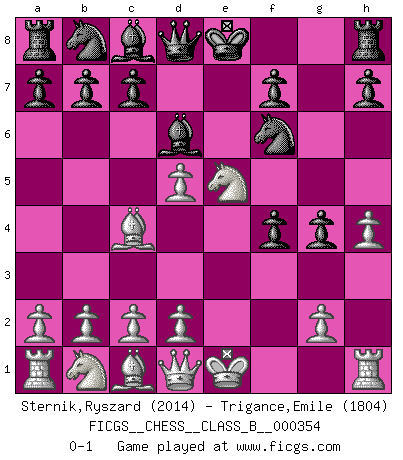 Last move : 0-1 2022 June 22 6:19:50 [Event "FICGS__CHESS__CLASS_B__000354"] [Site "FICGS"] [Date "2022.05.01"] [Round "1"] [White "Sternik,Ryszard"] [Black "Trigance,Emile"] [Result "0-1"] [WhiteElo "2014"] [BlackElo "1804"] 1.e4 e5 2.f4 exf4 3.Nf3 g5 4.h4 g4 5.Ne5 Nf6 6.Bc4 d5 7.exd5 Bd6 0-1 This chess game has been lost on time (started : 2022.05.01 14:19:46) KGA : Kieseritsky, Berlin defense, 6.Bc4 Player Black won this chess game. Follow this game move after move (download)Weak points or holes in the opponent's position must be occupied by pieces not Pawns. (Siegbert Tarrasch) Zu meiner Zeit war ein 20 jähriger ein junger Spieler, heute ist er ein Veteran. (Garry Kasparov) La caracteristica mas importante en la posición del Ajedrez es la actividad de las piezas. Esto es absolutamente fundamental en todas las fases del juego: Apertura, Juego Medio y especialmente Finales. La limitación primordial en la actividad de una pieza, es la estructuración de los Peones. (Michael Stean) Le thème de l'attaque double intervient d'une manière ou d'une autre dans l'immense majorité des combinaisons. (Youri Averbakh) The mind is like a parachute, it only functions when its open. (Unknown)