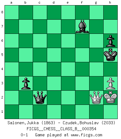 Last move : 0-1 2022 September 27 6:18:22 [Event "FICGS__CHESS__CLASS_B__000354"] [Site "FICGS"] [Date "2022.05.01"] [Round "1"] [White "Salonen,Jukka"] [Black "Czudek,Bohuslav"] [Result "0-1"] [WhiteElo "1863"] [BlackElo "2033"] 1.d4 d5 2.Nc3 Nf6 3.Nf3 e6 4.Bg5 h6 5.Bxf6 Qxf6 6.e4 Bb4 7.e5 Qd8 8.a3 Be7 9.Bd3 c5 10.dxc5 Bxc5 11.O-O a6 12.Ne2 Nd7 13.Nc1 g5 14.Nb3 Bb6 15.Re1 g4 16.Nfd4 Qg5 17.Qe2 Bc7 18.g3 Nxe5 19.c4 dxc4 20.Bxc4 O-O 21.Rac1 Bb8 22.f4 gxf3 23.Nxf3 Nxf3+ 24.Qxf3 Be5 25.Re4 Bg7 26.Rg4 Qf5 27.Qe2 Kh8 28.Rh4 Qg5 29.Re1 b5 30.Bd3 f5 31.Nc5 e5 32.Bc2 e4 33.b4 a5 34.Rf4 axb4 35.axb4 Bd4+ 36.Kg2 Ra2 37.Rd1 Rg8 38.Kh1 Rd8 39.Rd2 Bg7 40.Rxd8+ Qxd8 41.Rf1 e3 42.Rd1 Qe8 43.Rc1 Bd4 44.Kg1 Qc6 45.Qd3 Qd5 46.h3 e2 47.Kh2 Qc4 48.Qd2 e1Q 49.Qxe1 Rxc2+ 50.Rxc2 Qxc2+ 51.Kh1 Bxc5 52.Qe5+ Kh7 53.Qc7+ Kg6 54.bxc5 Be6 55.Qd8 Qxc5 56.Kh2 b4 57.g4 b3 58.Qe8+ Bf7 59.gxf5+ Qxf5 60.Qc6+ Kh5 61.Qg2 Qc2 0-1 Queen's pawn : Chigorin variation Kingside Castling by player White (move 11) Kingside Castling by player Black (move 20) Promotion Queen by player Black (move 48) 10 pieces endgame at move 55 : White KQPP , Black KQBPPP WHITE : King + 1 Queen 2 Pawns BLACK : King + 1 Queen 1 Bishop 3 Pawns 9 pieces endgame at move 59 : White KQPP , Black KQBPP WHITE : King + 1 Queen 2 Pawns BLACK : King + 1 Queen 1 Bishop 2 Pawns 8 pieces endgame at move 59 : White KQP , Black KQBPP WHITE : King + 1 Queen 1 Pawn BLACK : King + 1 Queen 1 Bishop 2 Pawns Player Black won this chess game. Follow this game move after move (download)It began to feel as though you were playing against Chess itself. - On playing against Robert Fischer. (Walter Shipman) Nach Morphy wurde nichts neues mehr in der Behandlung offener Positionen gefunden. (Mikhail Moiseyevich Botvinik) Las combinaciones han sido siempre el aspecto más intrigante del Ajedrez. Los Maestros las buscan, el público las aplauden, los críticos las alaban. La razón se debe a que las combinaciones hacen posible que el Ajedrez sea más que un ejercicio matemático con una carencia de vida. Ellas son la poesía del juego, son del Ajedrez lo que la melodía es de la música. Ellas representan el triunfo de la mente sobre la materia. (Reuben Fine) Il s'avisa de me proposer d'apprendre les échecs qu'il jouait un peu... me voilà forcené des échecs. J'achète un échiquier, je m'enferme dans ma chambre, j'y passe des jours et des nuits à vouloir apprendre par cur toutes les parties. (Jean-Jacques Rousseau, Confessions) The meaning of life is that it is to be lived, and it is not to be traded and conceptualized and squeezed into a pattern of systems. (Bruce Lee)