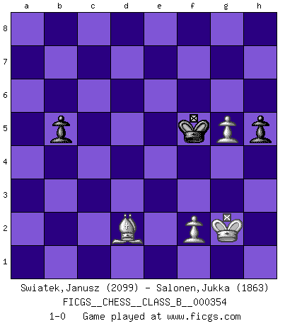 Last move : 1-0 2022 July 19 7:8:32 [Event "FICGS__CHESS__CLASS_B__000354"] [Site "FICGS"] [Date "2022.05.01"] [Round "1"] [White "Swiatek,Janusz"] [Black "Salonen,Jukka"] [Result "1-0"] [WhiteElo "2099"] [BlackElo "1863"] 1.d4 d5 2.c4 e6 3.Nf3 Nf6 4.Nc3 Be7 5.Bf4 O-O 6.e3 c5 7.dxc5 Bxc5 8.a3 Nc6 9.Qc2 Qa5 10.Rd1 a6 11.Nd2 Be7 12.Be2 Bd7 13.Bf3 Rfd8 14.O-O Rac8 15.Bg3 Qc5 16.Nb3 Qb6 17.cxd5 exd5 18.Bxd5 Bg4 19.Bf3 Bxf3 20.gxf3 Re8 21.Kg2 Bf8 22.Rb1 Ne5 23.Rfc1 g6 24.Nd4 Nc4 25.Qd3 Nxb2 26.Qd2 Bxa3 27.Rc2 Qb4 28.R1xb2 Bxb2 29.Ne4 Qe7 30.Nxf6+ Qxf6 31.Rxb2 b5 32.h4 Qb6 33.Rb1 Rc5 34.Ne2 Rd8 35.Qb2 Qc6 36.Qa1 Rc4 37.Rd1 Rxd1 38.Qxd1 Qe8 39.Nf4 Rc6 40.Nd5 Kg7 41.Nb4 Re6 42.Nd5 Rc6 43.Qd4+ f6 44.e4 Qd7 45.Bf4 Qf7 46.Bd2 h6 47.Bc3 Qd7 48.Qe3 Rd6 49.Qf4 Qd8 50.Bb4 Rxd5 51.exd5 Qxd5 52.Qc7+ Qf7 53.Qd6 g5 54.Qxa6 Qc4 55.Qb7+ Kg6 56.Qe4+ Qxe4 57.fxe4 h5 58.Bd2 f5 59.exf5+ Kxf5 60.hxg5 1-0 Queen's gambit declined Kingside Castling by player Black (move 5) Kingside Castling by player White (move 14) 10 pieces endgame at move 57 : White KBPPP , Black KPPPP WHITE : King + 1 Bishop 3 Pawns BLACK : King + 4 Pawns 9 pieces endgame at move 59 : White KBPPP , Black KPPP WHITE : King + 1 Bishop 3 Pawns BLACK : King + 3 Pawns 8 pieces endgame at move 59 : White KBPP , Black KPPP WHITE : King + 1 Bishop 2 Pawns BLACK : King + 3 Pawns 7 pieces endgame at move 60 : White KBPP , Black KPP WHITE : King + 1 Bishop 2 Pawns BLACK : King + 2 Pawns Player White won this chess game. Follow this game move after move (download)If a ruler does not understand Chess, how can he rule over a kingdom ? (King Khusros II) Pläne sind die Träume des Verständigen. (Ernst Freiherr von Feuchtersleben) Todavía soy una víctima del Ajedrez. Tiene toda la belleza del arte y mucho mas. No puede ser comercializado. El Ajedrez es mas puro que el arte en su posición social. (Marcel Duchamp) D'abord les bases : Jouez et étudiez, puis étudiez et jouez, ensuite jouez et étudiez, puis étudiez et jouez. Deuxièmement : Donnez toujours le meilleur de vous-même ! (Ken Smith) Home computers are being called upon to perform many new functions, including the consumption of homework formerly eaten by the dog. (Doug Larson)