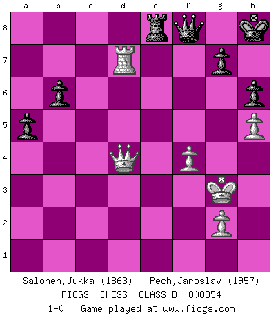 Last move : 1-0 2022 October 30 8:24:46 [Event "FICGS__CHESS__CLASS_B__000354"] [Site "FICGS"] [Date "2022.05.01"] [Round "1"] [White "Salonen,Jukka"] [Black "Pech,Jaroslav"] [Result "1-0"] [WhiteElo "1863"] [BlackElo "1957"] 1.e4 e6 2.d4 d5 3.Nc3 Bb4 4.e5 c5 5.a3 Bxc3+ 6.bxc3 Ne7 7.Nf3 b6 8.a4 Qc7 9.Bb5+ Bd7 10.O-O Bxb5 11.axb5 O-O 12.h4 h6 13.h5 Rc8 14.Re1 cxd4 15.Nxd4 Nd7 16.Re3 Nc5 17.Qg4 Ne4 18.Ba3 Qd7 19.Bxe7 Qxe7 20.Nc6 Qc5 21.Ra4 Kh8 22.c4 Rxc6 23.bxc6 Qxc6 24.Rb4 Qc5 25.cxd5 Qxb4 26.Rxe4 Qb1+ 27.Kh2 exd5 28.Rf4 Qe1 29.Rxf7 Qxe5+ 30.f4 Qc3 31.Qe6 Qd4 32.c3 Qxc3 33.Qxd5 Qc8 34.Rd7 Qf8 35.Kg3 a5 36.Rd6 Rb8 37.Qe5 Kg8 38.Rd7 Re8 39.Qd5+ Kh8 40.Qd4 1-0 French : Winawer, Advance, positional Main line Kingside Castling by player White (move 10) Kingside Castling by player Black (move 11) Player White won this chess game. Follow this game move after move (download)I believe that Chess possesses a magic that is also a help in advanced age. A rheumatic knee is forgotten during a game of Chess and other events can seem quite unimportant in comparison with a catastrophe on the chessboard. (Vlastimil Hort) Ivan Sokolov treibt mich als Beifahrer an mit go Loeky go - . (Loek van Wely) Un entendimiento a fondo de las continuaciones típicas del mate, hace de las combinaciones de sacrificio mas complicadas conducirlas a ellas no solo sin dificultad, sino casi de una manera natural. (Siegbert Tarrasch) Les Echecs sont affaire de jugement sensible. Savoir quand frapper et quand esquiver. (Fischer) All the biggest technological inventions created by man - the airplane, the automobile, the computer - says little about his intelligence, but speaks volumes about his laziness. (Mark Kennedy)