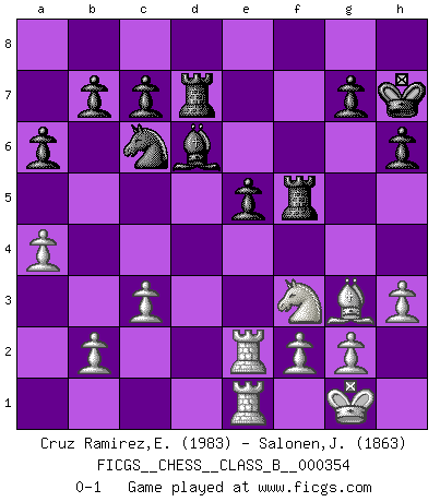 Last move : 0-1 2022 August 6 16:30:2 [Event "FICGS__CHESS__CLASS_B__000354"] [Site "FICGS"] [Date "2022.05.01"] [Round "1"] [White "Cruz Ramirez,Eliecer"] [Black "Salonen,Jukka"] [Result "0-1"] [WhiteElo "1983"] [BlackElo "1863"] 1.e4 e5 2.Nf3 Nc6 3.Bc4 Bc5 4.c3 Nf6 5.d3 d6 6.Ng5 O-O 7.O-O a6 8.Nf3 d5 9.exd5 Nxd5 10.Re1 Bg4 11.h3 Be6 12.Nbd2 f6 13.d4 Ba7 14.Bb3 Qe8 15.dxe5 fxe5 16.Ne4 Rd8 17.Neg5 Kh8 18.Nxe6 Qxe6 19.Bg5 Rd7 20.Qe2 h6 21.Bh4 Qf5 22.Bc2 Nf4 23.Bxf5 Nxe2+ 24.Rxe2 Rxf5 25.Bg3 Bc5 26.Rae1 Bd6 27.a4 Kh7 0-1 Giuoco Piano Kingside Castling by player Black (move 6) Kingside Castling by player White (move 7) Player Black won this chess game. Follow this game move after move (download)Chess, like love, like music, has the power to make people happy. (Siegbert Tarrasch) Man braucht nicht immer den besten Zug zu spielen: Ein Zug muß aktiv, unternehmungslustig, korrekt und schön sein. (David Bronstein) Robert Fischer es la ley hacia si mismo. (Larry Evans) Les échecs, c'est l'art d'analyser. (Mikhail Botvinnik) At last I discovered the true beauty of chess. So I proposed to her. (Dinesh De Silva)