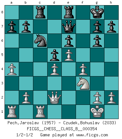 Last move : 1/2-1/2 2022 October 10 2:55:47 [Event "FICGS__CHESS__CLASS_B__000354"] [Site "FICGS"] [Date "2022.05.01"] [Round "1"] [White "Pech,Jaroslav"] [Black "Czudek,Bohuslav"] [Result "1/2-1/2"] [WhiteElo "1957"] [BlackElo "2033"] 1.d4 d5 2.c4 c6 3.Nf3 Nf6 4.Nc3 dxc4 5.a4 Bf5 6.e3 e6 7.Bxc4 Bb4 8.O-O Nbd7 9.Qe2 Bg6 10.e4 O-O 11.Bd3 Bh5 12.e5 Nd5 13.Nxd5 cxd5 14.Qe3 Re8 15.Bd2 Qa5 16.Bxb4 Qxb4 17.Qd2 Qe7 18.Ne1 Bg6 19.Bxg6 fxg6 20.f4 Rac8 21.Nf3 Nb8 22.Rfc1 Nc6 1/2-1/2 QGD Slav : Dutch variation Kingside Castling by player White (move 8) Kingside Castling by player Black (move 10) This chess game ended in a draw. Follow this game move after move (download)Fischer was a master of clarity and a king of artful positioning. His opponents would see where he was going but were powerless to stop him. (Bruce Pandolfini) Das Schachspiel hat wie die Liebe, die Musik, die Fähigkeit, den Menschen glücklich zu machen. Ich habe ein leises Gefühl des Bedauerns für jeden, der das Schachspiel nicht kennt, so wie ich jeden bedaure, der die Liebe nicht kennt. (Siegbert Tarrasch) Coloca el contenido del tablero de Ajedrez en un sombrero, agita las piezas vigorosamente, derrámalas en el tablero desde una altura de medio metro y así obtienes el estilo de Wilhelm Steinitz. (H. E. Bird) On n'a jamais que l'âge auquel on a commence à jouer aux échecs car après on cesse de vieillir. (Capablanca) This is where the fun begins. (Anakin Skywalker in Star Wars ep.3)
