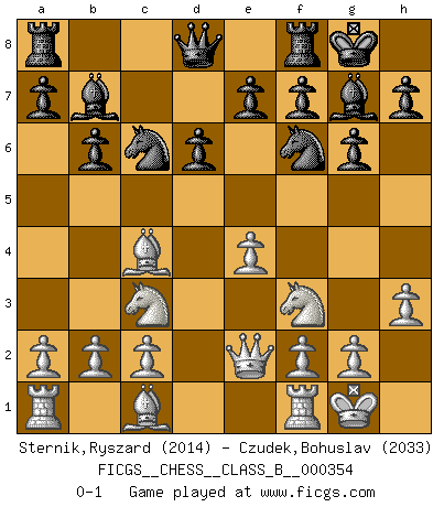 Last move : 0-1 2022 July 18 14:41:7 [Event "FICGS__CHESS__CLASS_B__000354"] [Site "FICGS"] [Date "2022.05.01"] [Round "1"] [White "Sternik,Ryszard"] [Black "Czudek,Bohuslav"] [Result "0-1"] [WhiteElo "2014"] [BlackElo "2033"] 1.e4 c5 2.Nf3 d6 3.d4 cxd4 4.Qxd4 Nc6 5.Qe3 g6 6.Bc4 Bg7 7.Nc3 Nf6 8.h3 b6 9.Qe2 Bb7 10.O-O O-O 0-1 Sicilian, Chekhover variation Kingside Castling by player White (move 10) Kingside Castling by player Black (move 10) Player Black won this chess game. Follow this game move after move (download)You are for me the Queen on d8 and I am the Pawn on d7 !! (Eduard Gufeld) Es hat in meinem Leben Zeiten gegeben, in denen das Schachspiel, wenn nicht zum Lebenszweck, so doch zu einem regelrechten Lebensersatz geworden ist. Man fühlt sich in solchen Zeiten nicht so, als besäße man eine göttliche Gabe, sondern eher so, als sei man von ihr besessen. (Garry Kasparov) Una victoria por una combinación errónea, aunque sea espectacular, me llena de horror artístico. (Wilhelm Steinitz) Si rien de grave n'est détecté lors de l'analyse d'une position, on joue alors le coup. Seconde règle de Blumenfeld. A good programmer is someone who always looks both ways before crossing a one-way street. (Doug Linder)