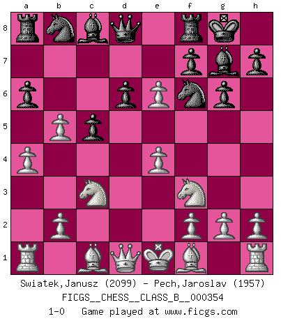 Last move : 1-0 2022 June 17 0:15:34 [Event "FICGS__CHESS__CLASS_B__000354"] [Site "FICGS"] [Date "2022.05.01"] [Round "1"] [White "Swiatek,Janusz"] [Black "Pech,Jaroslav"] [Result "1-0"] [WhiteElo "2099"] [BlackElo "1957"] 1.d4 Nf6 2.c4 c5 3.d5 b5 4.cxb5 a6 5.e3 g6 6.Nc3 Bg7 7.e4 O-O 8.a4 d6 9.Nf3 e6 10.dxe6 1-0 This chess game has been lost on time (started : 2022.05.01 14:19:46) Benko gambit half accepted Kingside Castling by player Black (move 7) Player White won this chess game. Follow this game move after move (download)No Chess Grandmaster is normal; they only differ in the extent of their madness. (Viktor Korchnoi) Sie bekommen vielleicht den Eindruck, dass die Spitzenspieler überhaupt gar nicht so stark sind. Aber das stimmt nicht. Es ist eine Illusion. Mit einem Computer an der Seite ist es sehr leicht, Urteile zu fällen, aber wenn man alleine am Brett sitzt, sieht die Sache ganz anders aus. (Vladimir Kramnik) Hasta este punto, las blancas han seguido un análisis bien conocido. Pero ahora el hace un error fatal: empieza a usar su propia cabeza. (Siegbert Tarrasch) Je menace de comprendre la position. (Anonyme) Philosophers use a language that is already deformed as though by shoes that are too tight. (Ludwig Wittgenstein)