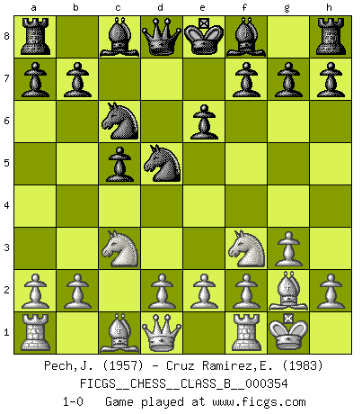 Last move : 1-0 2022 July 17 23:49:40 [Event "FICGS__CHESS__CLASS_B__000354"] [Site "FICGS"] [Date "2022.05.01"] [Round "1"] [White "Pech,Jaroslav"] [Black "Cruz Ramirez,Eliecer"] [Result "1-0"] [WhiteElo "1957"] [BlackElo "1983"] 1.c4 c5 2.Nc3 Nc6 3.Nf3 Nf6 4.g3 e6 5.Bg2 d5 6.cxd5 Nxd5 7.O-O 1-0 This chess game has been lost on time (started : 2022.05.01 14:19:46) English : Symmetrical, Four knights system Kingside Castling by player White (move 7) Player White won this chess game. Follow this game move after move (download)The tactician must know what to do whenever something needs doing; the strategist must know what to do when nothing needs doing. (Savielly Tartakover) Alles was am Schachbrett zählt sind gute Züge. (Robert James Fischer) Tu no necesitas jugar muy bien, únicamente ayudar a tu oponenet a que juegue muy mal. (Genrikh Chepukaitis) Les Echecs mettent en conflit, non pas deux intelligences, mais deux volontés. (Lasker) The difference between stupidity and genius is that genius has its limits. (Murphy)