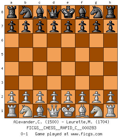 Last move : 0-1 2022 June 6 18:8:5 [Event "FICGS__CHESS__RAPID_C__000283"] [Site "FICGS"] [Date "2022.05.07"] [Round "1"] [White "Alexander,Chadwick"] [Black "Leurette,Marc-Antoine"] [Result "0-1"] [WhiteElo "1500"] [BlackElo "1704"] 0-1 This chess game has been lost on time (started : 2022.05.07 15:1:22) Player Black won this chess game. Follow this game move after move (download)When you see a good move, look for a better one. (Emanuel Lasker) Du musst Deinen Gegner in einen tiefen dunklen Wald führen wo 2+2=5 ist und wo der Weg, der wieder hinausführt, nur breit genug für einen ist. (Mikhail Nekhemyevich Tal) Los Peones son el alma de una partida de Ajedrez. (Francois Andre Danican Philidor) Avant la finale, les dieux ont créé le milieu de partie. (Tarrasch) Crush them ! Make them suffer ! (General Grievous in Star Wars ep.3)