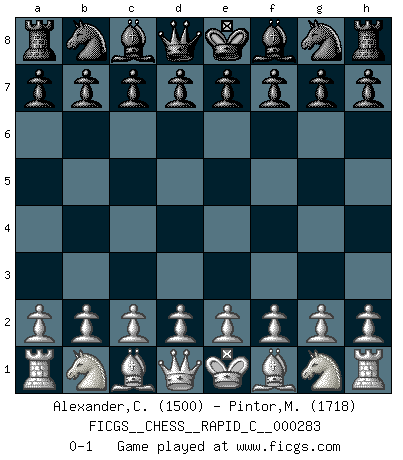 Last move : 0-1 2022 June 6 18:8:5 [Event "FICGS__CHESS__RAPID_C__000283"] [Site "FICGS"] [Date "2022.05.07"] [Round "1"] [White "Alexander,Chadwick"] [Black "Pintor,Manuel"] [Result "0-1"] [WhiteElo "1500"] [BlackElo "1718"] 0-1 This chess game has been lost on time (started : 2022.05.07 15:1:22) Player Black won this chess game. Follow this game move after move (download)Chess is like war on a board. (Bobby Fischer) Fischer: 'Remis!?' Uhlmann: 'Aber es muss doch dreimal Zugwiederholung sein!' Fischer: 'Sie nehmen das Remis an, wie ich es sage, sonst spiele ich weiter und werde Sie dann schlagen!' (Robert James Fischer) El muchacho (en ese entonces un niño de 12 años llamado Anatoly Karpov) no tiene ni idea de lo que es el Ajedrez y no hay futuro en absoluto para el en esta profesión. (Mikhail Botvinnik) Il (Jacob Murray) ne joue pas pour le bon coup, mais pour le meilleur. (Eloi Relange) It is not titles that honor men, but men that honor titles. (Niccolo Machiavelli)