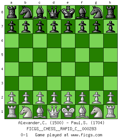 Last move : 0-1 2022 June 6 18:8:5 [Event "FICGS__CHESS__RAPID_C__000283"] [Site "FICGS"] [Date "2022.05.07"] [Round "1"] [White "Alexander,Chadwick"] [Black "Paul,Samagata"] [Result "0-1"] [WhiteElo "1500"] [BlackElo "1704"] 0-1 This chess game has been lost on time (started : 2022.05.07 15:1:22) Player Black won this chess game. Follow this game move after move (download)Morphy was probably the greatest genius of them all. (Bobby Fischer) Das Schachspiel übertrifft alle anderen Spiele so weit wie der Chimborasso einen Misthaufen. (Arthur Schopenhauer) En un gambito tu regalas un Peón por el bién de tomar un juego perdido. (Samuel Standige Boden) On croit qu'il y a plus de mauvais joueurs que de bons joueurs, c'est faux : Il y a autant de joueurs qui gagnent que de joueurs qui perdent. (Philippe Geluck) The ultimate in disposing one's troops is to be without ascertainable shape. Then the most penetrating spies cannot pry in nor can the wise lay plans against you. (Sun Tzu)