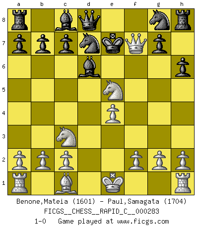 Last move : 1-0 2022 May 26 20:33:53 [Event "FICGS__CHESS__RAPID_C__000283"] [Site "FICGS"] [Date "2022.05.07"] [Round "1"] [White "Benone,Mateia"] [Black "Paul,Samagata"] [Result "1-0"] [WhiteElo "1601"] [BlackElo "1704"] 1.e4 e5 2.Nf3 d6 3.d4 Nd7 4.dxe5 dxe5 5.Bc4 h6 6.Bxf7+ Kxf7 7.Nxe5+ Kf6 8.Nc3 Bd6 9.Qf3+ Ke7 10.Qf7+ 1-0 Philidor : Hanham variation Player White won this chess game. Follow this game move after move (download)Chess is mental torture. (Garry Kasparov) Ich verstehe Aljechins Kombinationen ganz gut; aber woher er diese Angriffschancen bekommt und wie er die Eröffnung behandelt das ist für mich ein Buch mit sieben Siegeln. (Rudolf Spielmann) El jugador blanco perdió porque fallo en recordar la coreccta continuación y tuvo que pensar por sí mismo las movidas. (Siegbert Tarrasch) Demandez au pauvre Cg1 ce qu'il en pense. Eduard Gufeld à propos de la variante Saemisch de l'Est-Indienne. Thibault, I ask for draw. Game 13876. - Sorry Ilmars, you won. (FICGS chat)