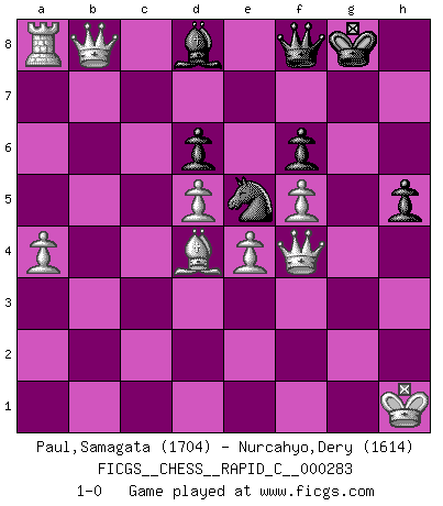 Last move : 1-0 2022 July 7 20:36:53 [Event "FICGS__CHESS__RAPID_C__000283"] [Site "FICGS"] [Date "2022.05.07"] [Round "1"] [White "Paul,Samagata"] [Black "Nurcahyo,Dery"] [Result "1-0"] [WhiteElo "1704"] [BlackElo "1614"] 1.e4 c5 2.c4 d6 3.Nc3 Nf6 4.d3 h6 5.h3 a6 6.Nf3 Nc6 7.Be3 e6 8.a3 Be7 9.Be2 O-O 10.d4 b6 11.g4 g5 12.O-O cxd4 13.Nxd4 Nxd4 14.Bd3 Nc6 15.f4 Nd7 16.b4 f6 17.Qe2 Bb7 18.f5 Qe8 19.Qf2 Nce5 20.Be2 exf5 21.gxf5 Bd8 22.Rac1 Rc8 23.Nd5 Bxd5 24.cxd5 Ra8 25.Kh1 b5 26.Rc3 Be7 27.Rfc1 Kg7 28.Bd4 Qf7 29.Rc7 Qe8 30.Rb7 Rc8 31.R1c7 Bd8 32.Rxc8 Qe7 33.Ra8 Nc4 34.Bxc4 bxc4 35.Qc2 Qe8 36.Rxa6 Rf7 37.R6a7 Re7 38.Qxc4 Qh5 39.Qd3 Qf7 40.Qb5 Qh5 41.Kg2 g4 42.Qd3 gxh3+ 43.Kh2 Qf7 44.Qg3+ Kf8 45.Qxh3 h5 46.Qe3 Qg7 47.Qf4 Ne5 48.Rxe7 Ng4+ 49.Kh1 Bxe7 50.Ra8+ Kf7 51.Ra7 Kg8 52.b5 Qf8 53.b6 Bd8 54.a4 Be7 55.b7 Ne5 56.Ra8 Bd8 57.b8Q 1-0 Sicilian defense Kingside Castling by player Black (move 9) Kingside Castling by player White (move 12) Promotion Queen by player White (move 57) Player White won this chess game. Follow this game move after move (download)My opponents make good moves too. Sometimes I don't take these things into consideration. (Bobby Fischer) Verschiedene, sehr schätzbare und im Laufe des Lebens nützliche Eigenschaften des Geistes können durch das Schachspiel erworben und gekräftigt werden, so dass sie zu Gewohnheiten werden, die uns nie im Stich lassen. (Benjamin Franklin) Nos gusta pensar. (Gary Kasparov) La guerre est enfant de la passion, la passion est enfant du narcissisme et le narcissisme est l'enfant. (...) Une autre partie ? (Thibault de Vassal) The project of the man are lower than those of the sky. (Chinese proverb)
