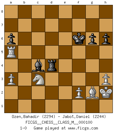 Last move : 1-0 2022 December 21 9:28:23 [Event "FICGS__CHESS__CLASS_M__000100"] [Site "FICGS"] [Date "2022.05.07"] [Round "1"] [White "Ozen,Bahadir"] [Black "Jabot,Daniel"] [Result "1-0"] [WhiteElo "2294"] [BlackElo "2244"] 1.Nf3 d5 2.g3 g6 3.Bg2 Bg7 4.d4 Nf6 5.c4 O-O 6.O-O dxc4 7.Na3 c3 8.bxc3 c5 9.Re1 Nd5 10.Bd2 Nc6 11.e4 Nb6 12.d5 Na5 13.Qc1 f5 14.c4 fxe4 15.Rxe4 Bf5 16.Rh4 Nd7 17.Bc3 Bf6 18.Qh6 Rf7 19.Qd2 Nb6 20.Rf4 Na4 21.Be5 Nc6 22.Bxf6 Rxf6 23.dxc6 Qxd2 24.Nxd2 bxc6 25.Ne4 Rf7 26.Re1 Rd8 27.Ng5 Rf6 28.Ne4 R6f8 29.h3 a6 30.Nb1 Rd4 31.Nbc3 Nxc3 32.Nxc3 Rxf4 33.gxf4 Bd3 34.Bxc6 Bxc4 35.Rxe7 Rxf4 36.Re5 h6 37.Rxc5 Kf8 38.Bg2 Rh4 39.Kh2 Rd4 40.a3 Ke7 41.Re5+ Kf6 42.Ra5 1-0 Reti : King's Indian attack Kingside Castling by player Black (move 5) Kingside Castling by player White (move 6) Player White won this chess game. Follow this game move after move (download)The essence of Chess is thinking about what Chess is. (David Bronstein) Die Neutralität betrachte ich als eine schwere Krankheit. (Viktor Kortschnoi) La única cosa que los jugadores de Ajedrez tienen en común, es el Ajedrez. (Lodewijk Prins) Les réformistes prétendent que les progrès de la théorie conduiront à la disparition des échecs, et qu'il faut, pour leur rendre vie, en remanier les règles. En réalité, qu'exprime cette affirmation? Le mépris de l'intuition, de l'imagination et de tous les autres éléments qui font des échecs un art. (Alexander Alekhine) A good book on your shelf is a friend that turns its back on you and remains a friend. (Author unknown)