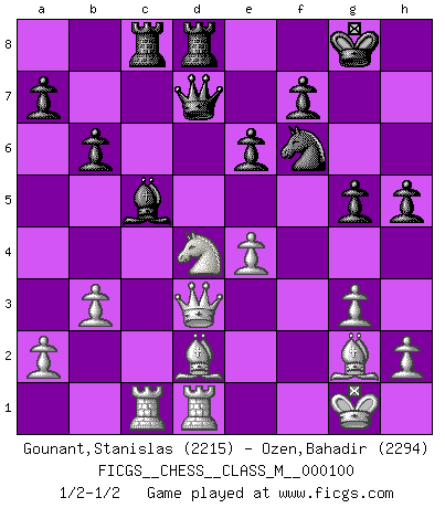 Last move : 1/2-1/2 2022 May 21 21:39:49 [Event "FICGS__CHESS__CLASS_M__000100"] [Site "FICGS"] [Date "2022.05.07"] [Round "1"] [White "Gounant,Stanislas"] [Black "Ozen,Bahadir"] [Result "1/2-1/2"] [WhiteElo "2215"] [BlackElo "2294"] 1.d4 Nf6 2.c4 e6 3.g3 Bb4+ 4.Bd2 Be7 5.Bg2 d5 6.Nf3 O-O 7.O-O c6 8.Qc2 b6 9.Bf4 Bb7 10.Rd1 Nbd7 11.Ne5 Nh5 12.Bd2 Nhf6 13.cxd5 cxd5 14.Nc6 Bxc6 15.Qxc6 Rc8 16.Qb5 Ne8 17.Qd3 Nd6 18.Nc3 Nf6 19.b3 Qd7 20.f3 Nf5 21.e3 Rfd8 22.Ne2 h5 23.Rac1 g5 24.e4 dxe4 25.fxe4 Nxd4 26.Nxd4 Bc5 1/2-1/2 Catalan Opening Kingside Castling by player Black (move 6) Kingside Castling by player White (move 7) This chess game ended in a draw. Follow this game move after move (download)Checkers is for tramps. (Paul Morphy) Ich habe die Schachforschung dermaßen betrieben, dass sie auf eine wissenschaftliche Basis gestellt wurde. (Mikhail Moiseyevich Botvinik) El Ajedrez no es una pizca de inferior al violín, y tenemos un gran número de violinistas profesionales. (Mikhail Botvinnik) L'ordinateur a tué l'originalité. Il n'y a plus guère d'aventures sur l'échiquier. (Jacob Murray) Either move or be moved. (Ezra Pound)