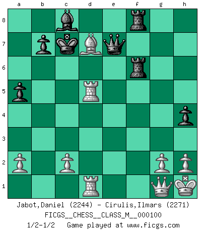 Last move : 1/2-1/2 2022 August 15 12:36:34 [Event "FICGS__CHESS__CLASS_M__000100"] [Site "FICGS"] [Date "2022.05.07"] [Round "1"] [White "Jabot,Daniel"] [Black "Cirulis,Ilmars"] [Result "1/2-1/2"] [WhiteElo "2244"] [BlackElo "2271"] 1.e4 c5 2.Nf3 d6 3.d4 cxd4 4.Nxd4 Nf6 5.Nc3 a6 6.Bg5 e6 7.f4 Qb6 8.Qd2 Qxb2 9.Rb1 Qa3 10.e5 dxe5 11.fxe5 h6 12.Bh4 g5 13.exf6 gxh4 14.Be2 Qa5 15.O-O Nd7 16.Kh1 Qg5 17.Rf4 e5 18.Nd5 exd4 19.Qxd4 Kd8 20.Ne7 Qe5 21.Qd2 Bxe7 22.fxe7+ Qxe7 23.Bg4 f5 24.Rxf5 a5 25.Rd5 Rf8 26.Rd1 Rf7 27.Qxh6 Ra6 28.Qh8+ Rf8 29.Qd4 Raf6 30.Qg1 Kc7 31.Bxd7 1/2-1/2 Sicilian : Najdorf, 7...Qb6 Kingside Castling by player White (move 15) This chess game ended in a draw. Follow this game move after move (download)All my games are real. (Bobby Fischer) Wenn ich Weiß habe gewinne ich weil ich Weiß habe, wenn ich Schwarz habe gewinne ich weil ich Bogoljubov bin. (Efim Bogoljubov) La última cosa en que Fischer estaba interesado era en tonterías, siempre y cuando el Ajedrez estuviera involucrado. (Elie Agur) J'ai toujours senti une vague pitié pour l'homme qui ne connaît rien aux échecs, tout comme j'en aurais pour un homme ignorant de l'amour. Les Echecs, comme la musique ou comme l'amour, ont le pouvoir de rendre heureux. (Siegbert Tarrasch) Every man's memory is his private literature. (Aldous Huxley)