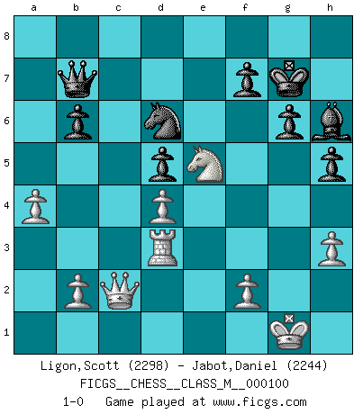 Last move : 1-0 2022 October 9 22:54:22 [Event "FICGS__CHESS__CLASS_M__000100"] [Site "FICGS"] [Date "2022.05.07"] [Round "1"] [White "Ligon,Scott"] [Black "Jabot,Daniel"] [Result "1-0"] [WhiteElo "2298"] [BlackElo "2244"] 1.Nf3 d5 2.g3 g6 3.Bg2 Bg7 4.d4 Nf6 5.c4 c6 6.cxd5 cxd5 7.Nc3 O-O 8.Ne5 e6 9.O-O Nbd7 10.Nd3 b6 11.e4 dxe4 12.Nxe4 Nd5 13.Bg5 Ne7 14.Nd6 Rb8 15.Bf4 Ba6 16.Re1 Bxd3 17.Qxd3 Nf6 18.Nb5 Rc8 19.Nxa7 Rc5 20.Nb5 Qd7 21.Nd6 Rh5 22.Nc4 Rf5 23.Rad1 Rxf4 24.gxf4 Qc7 25.Ne5 Nfd5 26.f5 Nxf5 27.Bxd5 exd5 28.Qb5 Qd8 29.Nf3 h5 30.h3 Qa8 31.a3 Qb7 32.Re8 Nd6 33.Rxf8+ Bxf8 34.Qb3 Bh6 35.Ne5 Bg7 36.a4 Bh6 37.Rd3 Kg7 38.Qc2 1-0 Reti : King's Indian attack Kingside Castling by player Black (move 7) Kingside Castling by player White (move 9) Player White won this chess game. Follow this game move after move (download)One of these modest little moves may be more embarrassing to your opponent than the biggest threat. (Siegbert Tarrasch) Eine Person mit durchschnittlichem IQ kann etwa eine ELO von 2000 erreichen. (Jonathan Levitt) En un gambito tu regalas un Peón por el bién de tomar un juego perdido. (Samuel Standige Boden) Toute estimation doit être constamment réévaluée. (Jacob Estrin) You think that education is too expensive ? Try ignorance. (Derek Bok)