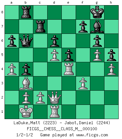 Last move : 1/2-1/2 2022 August 23 3:58:33 [Event "FICGS__CHESS__CLASS_M__000100"] [Site "FICGS"] [Date "2022.05.07"] [Round "1"] [White "LaDuke,Matt"] [Black "Jabot,Daniel"] [Result "1/2-1/2"] [WhiteElo "2223"] [BlackElo "2244"] 1.e4 c5 2.Nf3 d6 3.d4 cxd4 4.Nxd4 Nf6 5.Nc3 a6 6.Be3 e5 7.Nb3 Be6 8.Qd2 Nbd7 9.f3 b5 10.a4 b4 11.Nd5 Bxd5 12.exd5 Nb6 13.Bxb6 Qxb6 14.O-O-O g6 15.g4 Bg7 16.Bd3 O-O 17.Rhe1 Rfc8 18.Kb1 Rc7 19.h4 h5 20.g5 Nd7 21.Re4 Rb8 22.Bc4 Nc5 23.Nxc5 Rxc5 24.Bb3 Rc7 1/2-1/2 Sicilian : Najdorf, Byrne (English) attack Queenside Castling by player White (move 14) Kingside Castling by player Black (move 16) This chess game ended in a draw. Follow this game move after move (download)Fischer was a master of clarity and a king of artful positioning. His opponents would see where he was going but were powerless to stop him. (Bruce Pandolfini) Jeder Fehler erscheint unglaublich dumm, wenn andre ihn begehen. (Georg Christoph Lichtenberg) El Ajedrez es el arte del análisis. (Mikhail Botvinnik) Toutes choses étant égales, c'est la conviction qui gagne. Alliée à une volonté de vaincre, elle sert de détonateur, suscite des idées, disperse les doutes et aide à penser clairement. (Robert Fischer) The Internet is so big, so powerful and pointless that for some people it is a complete substitute for life. (Andrew Brown)