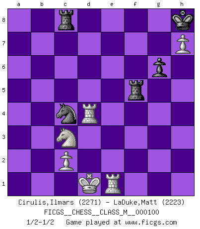 Last move : 1/2-1/2 2022 July 22 4:4:49 [Event "FICGS__CHESS__CLASS_M__000100"] [Site "FICGS"] [Date "2022.05.07"] [Round "1"] [White "Cirulis,Ilmars"] [Black "LaDuke,Matt"] [Result "1/2-1/2"] [WhiteElo "2271"] [BlackElo "2223"] 1.d4 Nf6 2.Nc3 d5 3.Bf4 e6 4.e3 Bb4 5.Nge2 O-O 6.g4 Nxg4 7.Rg1 Nf6 8.a3 Bd6 9.Qd2 Nc6 10.O-O-O Kh8 11.h4 Rb8 12.Bg5 b5 13.e4 Be7 14.e5 Ng8 15.Nf4 b4 16.axb4 Rxb4 17.Qe3 f6 18.exf6 Bxf6 19.Ba6 e5 20.Nfxd5 exd4 21.Qe2 Bxg5+ 22.hxg5 Rb8 23.Bd3 dxc3 24.Bxh7 cxb2+ 25.Kb1 Qe8 26.Be4 Ne5 27.Nc3 Rb4 28.Rh1+ Nh6 29.gxh6 g6 30.Qe3 Bf5 31.Bxf5 Rxf5 32.h7 Rbf4 33.Qxa7 Rxf2 34.Qxc7 Rf8 35.Rhe1 R2f5 36.Kxb2 Qb8+ 37.Qxb8 Nc4+ 38.Kc1 Rxb8 39.Rd4 Rc8 40.Kd1 1/2-1/2 Queen's pawn game Kingside Castling by player Black (move 5) Queenside Castling by player White (move 10) This chess game ended in a draw. Follow this game move after move (download)Not all artists are Chess players, but all Chess players are artists. (Marcel Duchamp) Im Leben werden Partien nie so unstrittig gewonnen wie im Spiel (Emanuel Lasker) Por esta medida (el intervalo entre Fischer y sus contemporaneos), yo le considero el mas grande campeón mundial. (Garry Kasparov) L'action d'une oeuvre littéraire se déroule sur un champ de bataille. Les masques et les types du drame moderne correspondent aux pièces du jeu d'échecs. L'intrigue correspond aux coups et aux gambits, c'est à dire aux techniques du jeu telles qu'utilisées et interprétées par les joueurs. Les tactiques et les péripéties [mouvements] correspondent aux coups exécutés par l'adversaire. (Viktor Shklovsky) Unless in communicating with it one says exactly what one means, trouble is bound to result. (Alan Turing, about computers)