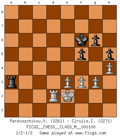 Last move : 1/2-1/2 2022 July 21 21:1:12 [Event "FICGS__CHESS__CLASS_M__000100"] [Site "FICGS"] [Date "2022.05.07"] [Round "1"] [White "Perevozchikov,Vjacheslav"] [Black "Cirulis,Ilmars"] [Result "1/2-1/2"] [WhiteElo "2261"] [BlackElo "2271"] 1.d4 f5 2.Nf3 Nf6 3.c4 g6 4.g3 Bg7 5.Bg2 O-O 6.O-O d6 7.Nc3 Qe8 8.d5 Na6 9.Rb1 Nc5 10.b3 Nfe4 11.Nxe4 Nxe4 12.Bb2 Bxb2 13.Rxb2 Qf7 14.Rc2 a5 15.a3 Qf6 16.Nd2 Nc3 17.Qe1 b5 18.Nb1 Nxb1 19.Qxb1 b4 20.Ra2 Bd7 21.e3 h5 22.h4 bxa3 23.Qa1 Qxa1 24.Rfxa1 Rfb8 25.Rxa3 Kf7 26.Rxa5 Rxa5 27.Rxa5 Rxb3 28.Ra7 Rc3 29.Rxc7 Bb5 30.Bf1 Ba4 31.Ra7 Bd1 32.Kg2 Bc2 33.Be2 Be4+ 34.f3 Bd3 35.Bxd3 Rxd3 36.Kf2 Rd2+ 37.Ke1 Rc2 38.Rc7 Rc3 39.Kd2 Ra3 40.c5 dxc5 41.d6 c4 42.Rxe7+ Kf6 43.Rc7 Rd3+ 44.Ke2 Rxd6 45.Rxc4 Ra6 46.Rd4 Ra3 47.Rd3 Ra2+ 48.Rd2 Ra3 49.Rd3 Ra2+ 50.Rd2 Ra3 1/2-1/2 Dutch Kingside Castling by player Black (move 5) Kingside Castling by player White (move 6) This chess game ended in a draw. Follow this game move after move (download)Live, lose, and learn, by observing your opponent how to win. (Amber Steenbock) Ich würde die 30 stärksten Spieler der USA im Simultanspiel besiegen. (José Raúl Capablanca) Existen dos clases de sacrificios: los correctos y los míos. (Mikhail Tal) A ce moment-là, je menaçais de comprendre la position ! (Clément L'Heureux) Whoever said the pen is mightier than the sword obviously never encountered automatic weapons. (US General Douglas MacArthur)