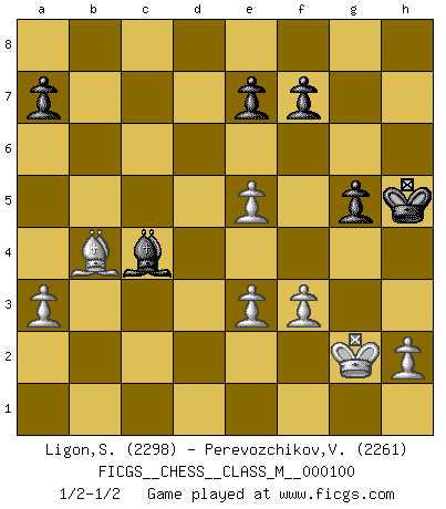Last move : 1/2-1/2 2022 July 5 1:15:34 [Event "FICGS__CHESS__CLASS_M__000100"] [Site "FICGS"] [Date "2022.05.07"] [Round "1"] [White "Ligon,Scott"] [Black "Perevozchikov,Vjacheslav"] [Result "1/2-1/2"] [WhiteElo "2298"] [BlackElo "2261"] 1.Nf3 Nf6 2.g3 g6 3.c4 Bg7 4.d4 c6 5.Nc3 d5 6.cxd5 cxd5 7.Bg2 O-O 8.Ne5 Bf5 9.Bf4 Qb6 10.O-O Qxb2 11.Nxd5 Nxd5 12.Bxd5 Nc6 13.Bxc6 Bxe5 14.dxe5 bxc6 15.Re1 c5 16.Qc1 Qd4 17.Rd1 Qb4 18.Bg5 Rfe8 19.f3 c4 20.g4 Be6 21.Rb1 Qc5+ 22.Qe3 Rac8 23.Rdc1 Qxe3+ 24.Bxe3 c3 25.Rc2 Rc7 26.Rbc1 Rec8 27.Bf2 g5 28.Bd4 Kg7 29.a3 Kg6 30.Kg2 h5 31.Rxc3 Rxc3 32.Rxc3 Rxc3 33.gxh5+ Kxh5 34.Bxc3 Bb3 35.Bb4 Bc4 36.e3 1/2-1/2 Reti : King's Indian attack Kingside Castling by player Black (move 7) Kingside Castling by player White (move 10) This chess game ended in a draw. Follow this game move after move (download)Help your pieces so they can help you. (Paul Morphy) Es ist wirklich schade, dass so viele Schachspieler nicht auf ihr Äußeres achten! (Alexandra Kosteniuk) Alguna parte de un error es siempre correcto. (Savielly Tartakover) Le plus grand jeu de l'esprit jamais inventé, plus vous l'apprenez, plus vous y prenez du plaisir. (Garry Kasparov) Wisdom doesn't necessarily come with age. Sometimes age just shows up all by itself. (Tom Watson)