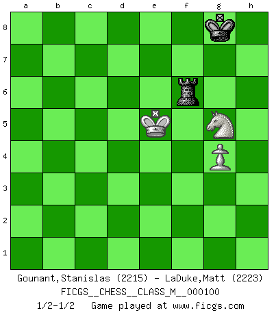 Last move : 1/2-1/2 2022 July 19 23:32:13 [Event "FICGS__CHESS__CLASS_M__000100"] [Site "FICGS"] [Date "2022.05.07"] [Round "1"] [White "Gounant,Stanislas"] [Black "LaDuke,Matt"] [Result "1/2-1/2"] [WhiteElo "2215"] [BlackElo "2223"] 1.d4 Nf6 2.c4 g6 3.g3 c6 4.Bg2 d5 5.Qa4 Bg7 6.cxd5 Nxd5 7.Nf3 Bg4 8.Nbd2 O-O 9.O-O Na6 10.e4 Ndb4 11.h3 Be6 12.a3 Nd3 13.Rd1 Qd7 14.Bf1 Nxc1 15.Raxc1 Bxh3 16.Bxa6 bxa6 17.Rxc6 Rab8 18.b3 Rbd8 19.Rc4 Be6 20.d5 Bg4 21.Qxd7 Rxd7 22.Rdc1 e6 23.Rc7 Rxc7 24.Rxc7 exd5 25.exd5 Rc8 26.Rxa7 Rd8 27.Rxa6 Rxd5 28.Ra8+ Bf8 29.b4 Kg7 30.Kg2 Bf5 31.Re8 Be6 32.Kf1 g5 33.Nc4 Rd3 34.Rxe6 fxe6 35.Nxg5 Rc3 36.Nxe6+ Kf7 37.Ng5+ Kg8 38.Ne3 Rxa3 39.Nd5 Rd3 40.Nf6+ Kh8 41.Nfxh7 Be7 42.Ke2 Rd5 43.f4 Kg8 44.g4 Rd4 45.Ke3 Rxb4 46.f5 Rb3+ 47.Kd4 Rb6 48.f6 Bxf6+ 49.Nxf6+ Rxf6 50.Ke5 1/2-1/2 King's Indian : 3.g3 Kingside Castling by player Black (move 8) Kingside Castling by player White (move 9) 10 pieces endgame at move 38 : White KNNPPP , Black KRBP WHITE : King + 2 Knights 3 Pawns BLACK : King + 1 Rook 1 Bishop 1 Pawn 9 pieces endgame at move 41 : White KNNPPP , Black KRB WHITE : King + 2 Knights 3 Pawns BLACK : King + 1 Rook 1 Bishop 8 pieces endgame at move 45 : White KNNPP , Black KRB WHITE : King + 2 Knights 2 Pawns BLACK : King + 1 Rook 1 Bishop 7 pieces endgame at move 48 : White KNNP , Black KRB WHITE : King + 2 Knights 1 Pawn BLACK : King + 1 Rook 1 Bishop 6 pieces endgame at move 49 : White KNNP , Black KR WHITE : King + 2 Knights 1 Pawn BLACK : King + 1 Rook 5 pieces endgame at move 49 : White KNP , Black KR WHITE : King + 1 Knight 1 Pawn BLACK : King + 1 Rook This chess game ended in a draw. Follow this game move after move (download)Capture of the adverse King is the ultimate but not the first object of the game. (William Steinitz) Taktik ist was man tun muß, wenn etwas zu tun ist. Strategie ist was man tun muß, wenn nichts zu tun ist. (Savielly Grigorievitsch Tartakower) Desconfianza es la característica mas necesaria de un jugador de Ajedrez. (Siegbert Tarrasch) Les ravages du H expliquent la différence de niveau entre Tal et Thal [Abergel]. Art is not a thing, it is a way. (Elbert Hubbard)