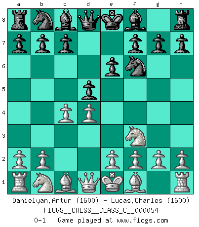 Last move : 0-1 2007 September 14 2:15:37 [Event "FICGS__CHESS__CLASS_C__000054"] [Site "FICGS"] [Date "2007.08.01"] [Round "1"] [White "Danielyan,Artur"] [Black "Lucas,Charles"] [Result "0-1"] [WhiteElo "1600"] [BlackElo "1600"] 1.d4 d5 2.c4 e6 3.Nf3 Nf6 0-1 This chess game has been lost on time (started : 2007.08.01 15:54:42) Queen's gambit declined Player Black won this chess game. Follow this game move after move (download)Chess is the art of analysis. (Mikhail Botvinnik) Frage des Reporters: -Worin besteht das Ziel von Gambiteröffnungen? Antwort: -Auf Kosten der Partie einen Ruf als Angriffspieler zu erwerben.- (Siegbert Tarrasch) Hay jugadores fuertes y personas amables y yo soy un jugador fuerte. (Bobby Fischer) Pour se monter efficace, un Cavalier a besoin d'avant-postes ! Les Cavaliers font les meilleurs bloqueurs de pions passés. True nature is revealed in times of difficulty. (Chinese proverb)