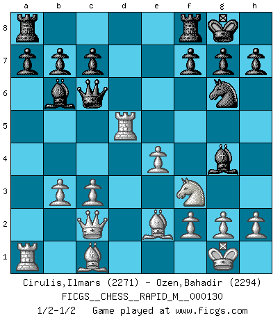 Last move : 1/2-1/2 2022 May 17 11:42:49 [Event "FICGS__CHESS__RAPID_M__000130"] [Site "FICGS"] [Date "2022.05.07"] [Round "1"] [White "Cirulis,Ilmars"] [Black "Ozen,Bahadir"] [Result "1/2-1/2"] [WhiteElo "2271"] [BlackElo "2294"] 1.e4 e5 2.Nf3 Nc6 3.Bc4 Bc5 4.b4 Bxb4 5.c3 Ba5 6.d4 d6 7.Qb3 Qd7 8.O-O Bb6 9.Nbd2 Na5 10.Qc2 Ne7 11.dxe5 Ng6 12.exd6 Qxd6 13.Rd1 O-O 14.Nb3 Qc6 15.Be2 Nxb3 16.axb3 Bg4 17.Rd5 1/2-1/2 Evans gambit : Tartakower attack Kingside Castling by player White (move 8) Kingside Castling by player Black (move 13) This chess game ended in a draw. Follow this game move after move (download)The tactician knows what to do when there is something to do; whereas the strategian knows what to do when there is nothing to do. (Gerald Abrahams) Das Schachspiel übertrifft alle anderen Spiele so weit wie der Chimborasso einen Misthaufen. (Arthur Schopenhauer) No es suficiente ser un buen jugador, se debe también de jugar bién. (Siegbert Tarrasch) Ne tendez aucun piège pour le plaisir ! Ne jouez rien dans l'espoir que l'adversaire réagisse de façon stupide ! Prenez toujours pour acquis que l'adversaire va trouver le meilleur coup ! Ne jouez jamais de coup dans l'espoir que l'adversaire ne voie pas la menace ! Chacun de vos coups doit améliorer la position d'une façon ou d'une autre. You must have a dream in order to have it come true. (A.P.J. Kalam)