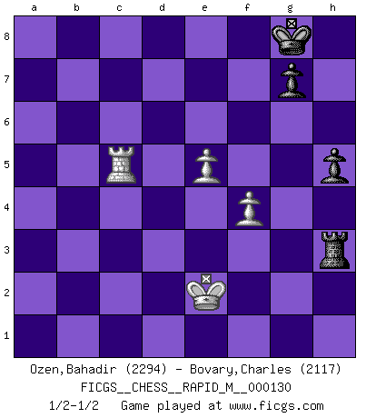 Last move : 1/2-1/2 2022 June 16 7:20:2 [Event "FICGS__CHESS__RAPID_M__000130"] [Site "FICGS"] [Date "2022.05.07"] [Round "1"] [White "Ozen,Bahadir"] [Black "Bovary,Charles"] [Result "1/2-1/2"] [WhiteElo "2294"] [BlackElo "2117"] 1.Nf3 d5 2.g3 Bg4 3.Bg2 Nf6 4.O-O Nbd7 5.c4 e6 6.cxd5 exd5 7.h3 Bxf3 8.Bxf3 c6 9.d3 Bd6 10.e4 O-O 11.Nc3 dxe4 12.dxe4 Qe7 13.Bg2 Rfe8 14.f4 Bb4 15.e5 Qc5+ 16.Rf2 Bxc3 17.bxc3 Nd5 18.Qd4 Nxc3 19.Be3 Qxd4 20.Bxd4 Nb5 21.Be3 Nb6 22.a4 Nc3 23.a5 Nbd5 24.Bc5 b6 25.Bd6 Rac8 26.Rb2 f5 27.Rc2 Ne4 28.Bxe4 fxe4 29.Kf2 c5 30.axb6 axb6 31.Rd1 Ne7 32.Bxe7 Rxe7 33.Rb1 Rd7 34.Rxb6 Rd3 35.Rc4 Ra8 36.Rxe4 Ra2+ 37.Re2 Rxe2+ 38.Kxe2 Rxg3 39.Rc6 Rxh3 40.Rxc5 h5 1/2-1/2 Reti : King's Indian attack (Barcza system) Kingside Castling by player White (move 4) Kingside Castling by player Black (move 10) 10 pieces endgame at move 38 : White KRPPP , Black KRPPP WHITE : King + 1 Rook 3 Pawns BLACK : King + 1 Rook 3 Pawns 9 pieces endgame at move 39 : White KRPP , Black KRPPP WHITE : King + 1 Rook 2 Pawns BLACK : King + 1 Rook 3 Pawns 8 pieces endgame at move 40 : White KRPP , Black KRPP WHITE : King + 1 Rook 2 Pawns BLACK : King + 1 Rook 2 Pawns This chess game ended in a draw. Follow this game move after move (download)Methodical thinking is of more use in Chess than inspiration. (C. J. S. Purdy) Die westlichen Werte sind eine Sprache, welche die Putin-Administration nicht versteht. (Garry Kasparov) El Ajedrez es como la guerra en un tablero. (Bobby Fischer) Vouloir jouer aux échecs contre soi-même est aussi paradoxal que vouloir marcher sur son ombre. (Stefan Zweig) Follow your passion, and success will follow you. (Arthur Buddhold)