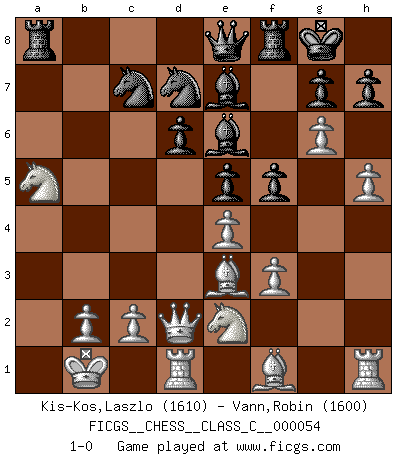 Last move : 1-0 2007 December 6 21:44:52 [Event "FICGS__CHESS__CLASS_C__000054"] [Site "FICGS"] [Date "2007.08.01"] [Round "1"] [White "Kis-Kos,Laszlo"] [Black "Vann,Robin"] [Result "1-0"] [WhiteElo "1610"] [BlackElo "1600"] 1.e4 c5 2.Nf3 d6 3.d4 cxd4 4.Nxd4 Nf6 5.Nc3 a6 6.Be3 e5 7.Nb3 Be6 8.f3 Be7 9.Qd2 O-O 10.O-O-O Nbd7 11.g4 b5 12.g5 b4 13.Ne2 Ne8 14.h4 a5 15.Kb1 a4 16.Nbc1 b3 17.axb3 axb3 18.Nxb3 Nc7 19.Na5 Qe8 20.h5 f5 21.g6 1-0 Sicilian : Najdorf, Byrne (English) attack Kingside Castling by player Black (move 9) Queenside Castling by player White (move 10) Player White won this chess game. Follow this game move after move (download)If Chess is a science, it's a most inexact one. If Chess is an art, it is too exacting to be seen as one. If Chess is a sport, it's too esoteric. If Chess is a game, it's too demanding to be just a game. If Chess is a mistress, she's a demanding one. If Chess is a passion, it's a rewarding one. If Chess is life, it's a sad one. (Unknown) Du musst Deinen Gegner in einen tiefen dunklen Wald führen wo 2+2=5 ist und wo der Weg, der wieder hinausführt, nur breit genug für einen ist. (Mikhail Nekhemyevich Tal) Sin errores no puede haber brillantez. (Emanuel Lasker) Assurément je connaissais par expérience le mystérieux attrait de ce jeu royal, le seul entre tous les jeux inventés par les hommes qui échappe souverainement à la tyrannie du hasard, le seul où l'on ne doive sa victoire qu'à son intelligence ou plutôt à une certaine forme d'intelligence. Mais n'est-ce pas déjà le limiter injurieusement que d'appeler les échecs un jeu ? N'est-ce pas une science, un art ou quelque chose qui, comme le cercueil de Mahomet entre ciel et terre, est suspendu entre l'un et l'autre, et qui réunit un nombre incroyable de contraires ? [...] C'est une pensée qui ne mène à rien, une mathématique qui n'établit rien, un art qui ne laisse pas d'uvre, une architecture sans matière; et il l'a prouvé néanmoins qu'il était plus durable, à sa manière, que les livres ou que tout autre monument, ce jeu unique qui appartient à tous les peuples et à tous les temps, et dont personne ne sait quel dieu en fit don à la terre pour tuer l'ennui, pour aiguiser l'esprit et stimuler l'âme. Où commence-t-il, où finit-il ? (Stefan Zweig) Beep ! (R2D2 in Star Wars ep.3)