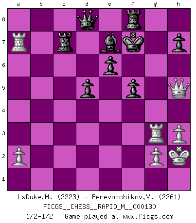 Last move : 1/2-1/2 2022 July 11 5:58:47 [Event "FICGS__CHESS__RAPID_M__000130"] [Site "FICGS"] [Date "2022.05.07"] [Round "1"] [White "LaDuke,Matt"] [Black "Perevozchikov,Vjacheslav"] [Result "1/2-1/2"] [WhiteElo "2223"] [BlackElo "2261"] 1.e4 e6 2.d4 d5 3.Nc3 Nf6 4.e5 Nfd7 5.f4 c5 6.Nf3 Nc6 7.Be3 cxd4 8.Nxd4 Qb6 9.Qd2 Qxb2 10.Rb1 Qa3 11.Bb5 Nxd4 12.Bxd4 a6 13.Bxd7+ Bxd7 14.Rb3 Qe7 15.Rxb7 Rc8 16.O-O Qd8 17.Qe3 Rc4 18.Rfb1 Be7 19.h3 O-O 20.Kh2 Qc8 21.f5 Kh8 22.Ne2 Rxc2 23.R1b3 Rc7 24.R7b6 Qd8 25.Nf4 Rc4 26.Rxa6 exf5 27.e6 Bc8 28.Ra7 Bxe6 29.Bxg7+ Kxg7 30.Nxe6+ fxe6 31.Qg5+ Kf7 32.Rg3 Rc7 33.Qh5+ Kf6 34.Qh6+ Kf7 35.Qh5+ Kf6 36.Qh6+ Kf7 37.Qh5+ 1/2-1/2 French : Steinitz, Boleslavsky variation Kingside Castling by player White (move 16) Kingside Castling by player Black (move 19) This chess game ended in a draw. Follow this game move after move (download)Chess is a beautiful mistress. (Bent Larsen) Ich suche im Schach immer etwas Eigenes. Riskantes Spiel im Stile schachlicher Musketiere ist nicht meine Sache, auch wenn es vielen Freunden scharfer Wendungen gefällt. (Anatoly Karpov) Una mala movida nulifica cuarenta buenas. (Horowitz) Karpov est une pièce de musée. (Garry Kasparov) Always two there are. No more no less. A master, and an apprentice. (Master Yoda in Star Wars ep.1)