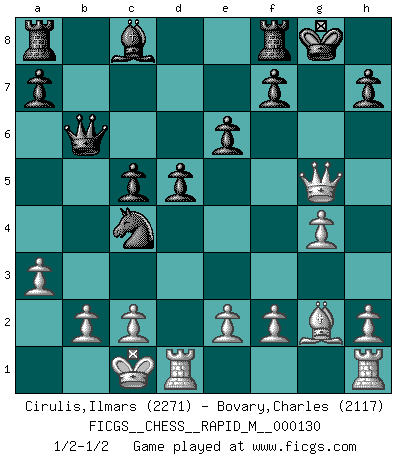 Last move : 1/2-1/2 2022 May 17 9:32:1 [Event "FICGS__CHESS__RAPID_M__000130"] [Site "FICGS"] [Date "2022.05.07"] [Round "1"] [White "Cirulis,Ilmars"] [Black "Bovary,Charles"] [Result "1/2-1/2"] [WhiteElo "2271"] [BlackElo "2117"] 1.d4 Nf6 2.Nc3 d5 3.Bf4 e6 4.Nf3 Bb4 5.Qd3 c5 6.dxc5 O-O 7.a3 Bxc3+ 8.Qxc3 Ne4 9.Qe3 Nc6 10.O-O-O b6 11.g4 bxc5 12.Bg2 Qb6 13.Ne5 Nxe5 14.Bxe5 Nd6 15.Qf4 Nc4 16.Bxg7 Kxg7 17.Qg5+ Kh8 18.Qf6+ Kg8 19.Qg5+ 1/2-1/2 Queen's pawn game Kingside Castling by player Black (move 6) Queenside Castling by player White (move 10) This chess game ended in a draw. Follow this game move after move (download)Many Chess players were surprised when after the game, Fischer quietly explained: 'I had already analyzed this possibility' in a position which I thought was not possible to foresee from the opening. (Mikhail Tal) Wie kann ich Remis annehmen? Ich weiß ja gar nicht, wie ich stehe! (Fritz Sämisch) No hay un Gran Maestro de Ajedrez que sea normal; solo se diferencían ellos por la magnitud de su locura. (Viktor Korchnoi) Vous n'êtes pas toujours obligé de jouer le meilleur coup. Un coup doit être actif, entreprenant, correct et beau ! (David Bronstein) Wawaweewa ! (Borat: Cultural learnings of America for make benefit glorious nation of Kazakhstan)