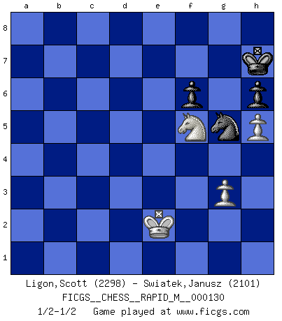Last move : 1/2-1/2 2022 July 12 20:53:56 [Event "FICGS__CHESS__RAPID_M__000130"] [Site "FICGS"] [Date "2022.05.07"] [Round "1"] [White "Ligon,Scott"] [Black "Swiatek,Janusz"] [Result "1/2-1/2"] [WhiteElo "2298"] [BlackElo "2101"] 1.Nf3 d5 2.g3 Nf6 3.Bg2 c5 4.O-O e6 5.c4 d4 6.d3 Nc6 7.e3 h6 8.exd4 cxd4 9.Bf4 Nd7 10.Re1 Bb4 11.Nbd2 a5 12.a3 Be7 13.Nb3 Qb6 14.Rb1 O-O 15.Na1 Rd8 16.h3 Ra6 17.b4 axb4 18.axb4 Bxb4 19.Bd2 Qc5 20.Bxb4 Nxb4 21.Nb3 Qf8 22.Nbxd4 Ra3 23.Re3 Nb8 24.Bf1 Bd7 25.Qc1 Ra2 26.Qc3 N8a6 27.Re4 Qe7 28.h4 f6 29.Nf5 Qf8 30.Ne3 Bc6 31.Nd4 Bxe4 32.Nxe6 Qd6 33.Nxd8 Bf3 34.Nxb7 Bxb7 35.c5 Qd7 36.d4 Kf8 37.Bxa6 Nxa6 38.d5 Bc8 39.c6 Qd6 40.Qd4 Ra5 41.Qa7 Qd8 42.d6 Qxd6 43.Rd1 Qc7 44.Qxc7 Nxc7 45.Rd8+ Ke7 46.Rxc8 Ne6 47.f4 f5 48.h5 Rc5 49.Kg2 Kf7 50.Ra8 Rxc6 51.Nxf5 Rc5 52.Ra7+ Kg8 53.Ne7+ Kh7 54.f5 Rc7 55.Rxc7 Nxc7 56.f6 gxf6 57.Nf5 Ne6 58.Kf3 Ng5+ 59.Ke2 1/2-1/2 Reti : King's Indian attack (Barcza system) Kingside Castling by player White (move 4) Kingside Castling by player Black (move 14) 10 pieces endgame at move 55 : White KRNPPP , Black KNPP WHITE : King + 1 Rook 1 Knight 3 Pawns BLACK : King + 1 Knight 2 Pawns 9 pieces endgame at move 55 : White KNPPP , Black KNPP WHITE : King + 1 Knight 3 Pawns BLACK : King + 1 Knight 2 Pawns 8 pieces endgame at move 56 : White KNPP , Black KNPP WHITE : King + 1 Knight 2 Pawns BLACK : King + 1 Knight 2 Pawns This chess game ended in a draw. Follow this game move after move (download)Life is like a game of Chess, changing with each move. (Chinese proverb) Die Leute spielen gegen mich seit 15 Jahren unter Ihren Möglichkeiten. (Robert James Fischer) Si el ingenio solamente fuese necesario para lucirse, las mujeres serían las mejores jugadoras de Ajedrez del mundo. (Albin) Vous m'avez demandé de vous exposer quel est le fondement de la prière. Je ne fais que préparer les pièces du jeu sur la table... Nous sera-t-il permis d'en adopter les règles et si nous les appliquons scrupuleusement nous ne tarderons pas à faire mat le Roi divin ! Il ne pourra échapper à nos mains. (Sainte Thérèse d'Avila, Chemin de perfection) Success without honor is an unseasoned dish; it will satisfy your hunger, but it won't taste good. (Joe Paterno)