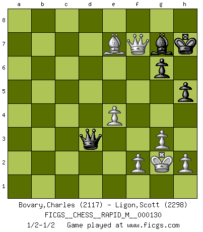 Last move : 1/2-1/2 2022 May 14 15:6:16 [Event "FICGS__CHESS__RAPID_M__000130"] [Site "FICGS"] [Date "2022.05.07"] [Round "1"] [White "Bovary,Charles"] [Black "Ligon,Scott"] [Result "1/2-1/2"] [WhiteElo "2117"] [BlackElo "2298"] 1.d4 Nf6 2.c4 g6 3.Nc3 d5 4.cxd5 Nxd5 5.e4 Nxc3 6.bxc3 Bg7 7.Nf3 c5 8.Rb1 O-O 9.Be2 cxd4 10.cxd4 Qa5+ 11.Bd2 Qxa2 12.O-O Bg4 13.Be3 Nc6 14.d5 Bxf3 15.Bxf3 Ne5 16.Rxb7 a5 17.Be2 Rfe8 18.Bc5 a4 19.Bb5 Rec8 20.Bxe7 a3 21.d6 Qe6 22.Ba4 Rc3 23.Rb3 Qc4 24.Rxc3 Qxc3 25.Bb3 a2 26.d7 Nxd7 27.Bxa2 Rxa2 28.Qxd7 h5 29.Qe8+ Kh7 30.Qxf7 Ra1 31.g3 Rxf1+ 32.Kxf1 Qd3+ 33.Kg2 1/2-1/2 King's Indian defense, 3.Nc3 Kingside Castling by player Black (move 8) Kingside Castling by player White (move 12) This chess game ended in a draw. Follow this game move after move (download)Avoid the crowd. Do your own thinking independently. Be the Chess player, not the Chess piece. (Ralph Charell) Kein Großmeister ist normal. Sie unterscheiden sich nur im Ausmaß Ihrer Verrücktheit. (Viktor Kortschnoi) No es suficiente ser un buen jugador, se debe también de jugar bién. (Siegbert Tarrasch) Les écrivains ont utilisé les échecs pour analyser les côtés extrêmes de la nature humaine. Dans ce cadre, les échecs offrent un champ d'expérimentation idéal. Mais on pourrait faire la même chose avec la peinture. Et là, en vous référant à Van Gogh, vous ne tirerez pas de conclusion définitive sur les peintres. (Gary Kasparov) It is not enough to be a good player... you must also play well. (Siegbert Tarrasch)