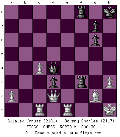 Last move : 1-0 2022 July 13 12:34:11 [Event "FICGS__CHESS__RAPID_M__000130"] [Site "FICGS"] [Date "2022.05.07"] [Round "1"] [White "Swiatek,Janusz"] [Black "Bovary,Charles"] [Result "1-0"] [WhiteElo "2101"] [BlackElo "2117"] 1.d4 Nf6 2.c4 e6 3.Nf3 c5 4.d5 b5 5.dxe6 fxe6 6.cxb5 d5 7.Nc3 a6 8.e4 Be7 9.exd5 exd5 10.Bg5 d4 11.Bxf6 Bxf6 12.Ne4 O-O 13.Bc4+ Kh8 14.O-O Bg4 15.h3 axb5 16.Bxb5 Bh5 17.Re1 Nd7 18.Nxf6 Rxf6 19.Be2 Bg6 20.Qd2 d3 21.Bf1 c4 22.Rac1 Qg8 23.Nh4 Raf8 24.Nxg6+ hxg6 25.f3 Qd5 26.b3 Ne5 27.bxc4 Nxf3+ 28.gxf3 Qd4+ 29.Kh1 Rxf3 30.Bg2 1-0 Blumenfeld counter-gambit accepted Kingside Castling by player Black (move 12) Kingside Castling by player White (move 14) Player White won this chess game. Follow this game move after move (download)Chess, like any creative activity, can exist only through the combined efforts of those who have creative talent, and those who have the ability to organize their creative work. (Mikhail Botvinnik) Ein Buch ist ein Spiegel; wenn ein Affe hineinsieht, so kann kein Apostel heraus gucken. (Georg Christoph Lichtenberg) Hay jugadores fuertes y personas amables y yo soy un jugador fuerte. (Bobby Fischer) La guerre est enfant de la passion, la passion est enfant du narcissisme et le narcissisme est l'enfant. (...) Une autre partie ? (Thibault de Vassal) It's unlucky to be superstitious. (Dave Enteles)